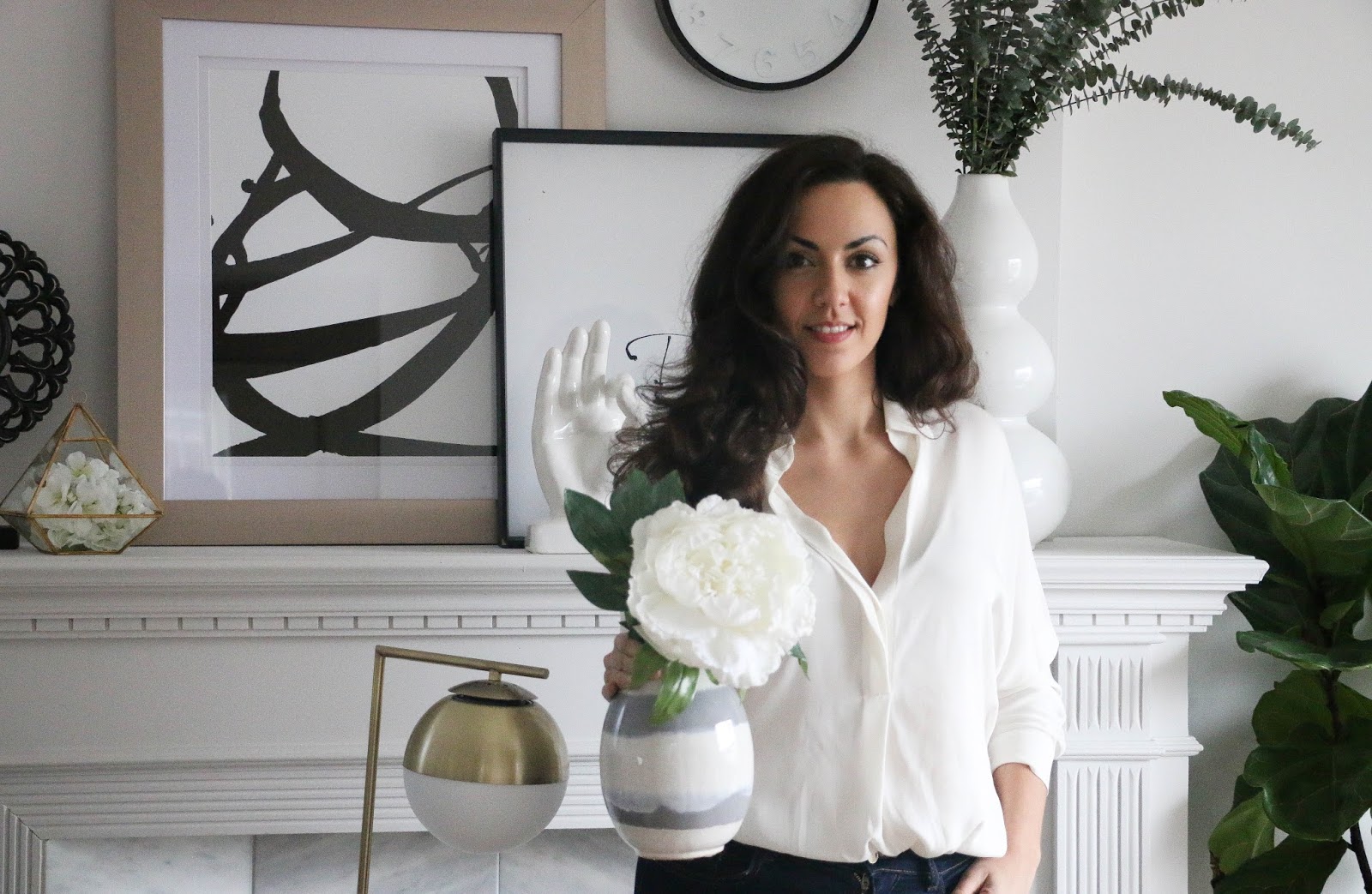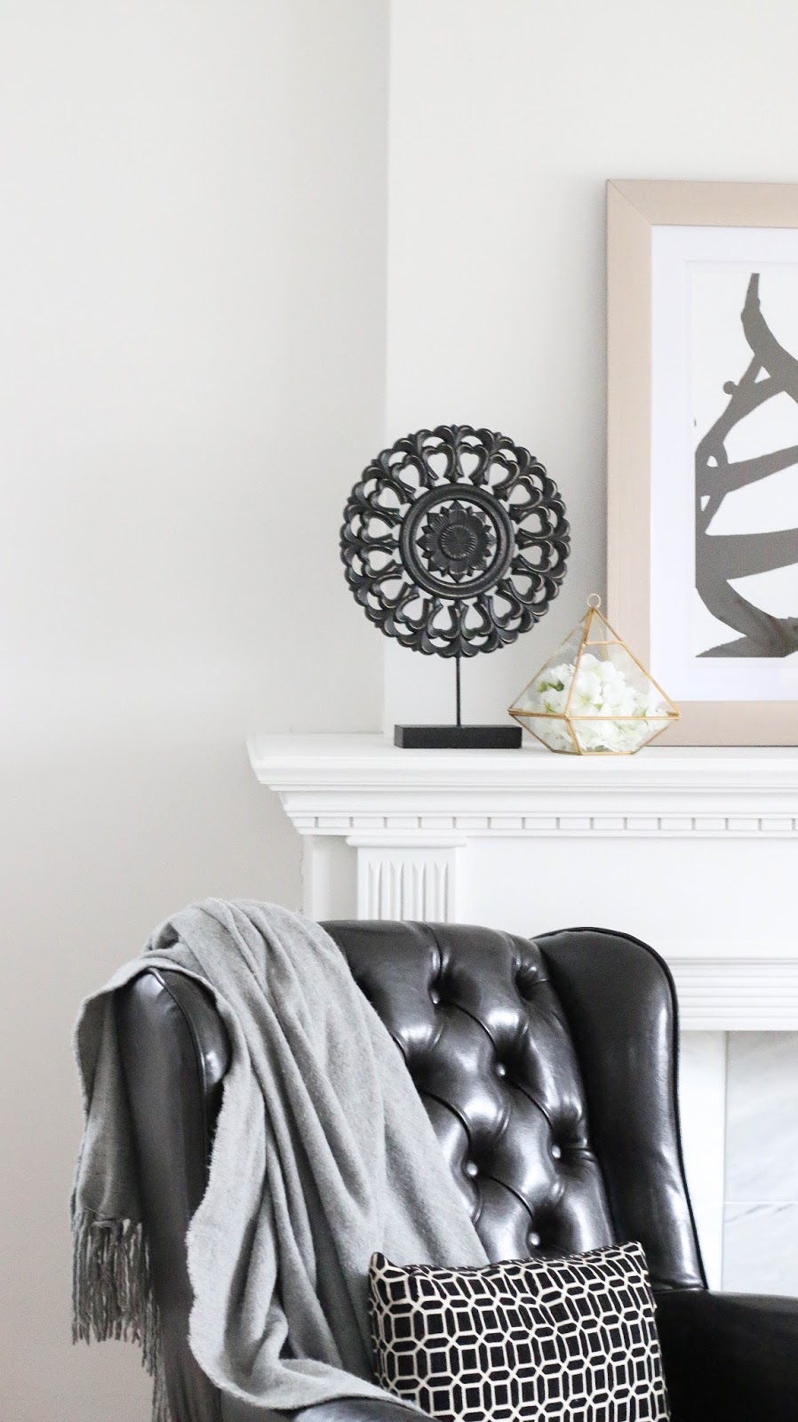 For this more contemporary style mantel I chose black and white pieces with wood and gold accents. The tufted black chair adds an androgynous vibe to the space, making a bold visual statement. The vase is filled with fresh eucalyptus which smells like heaven and dries beautifully. The simple black and white striped rug pulls the space together with subtlety.