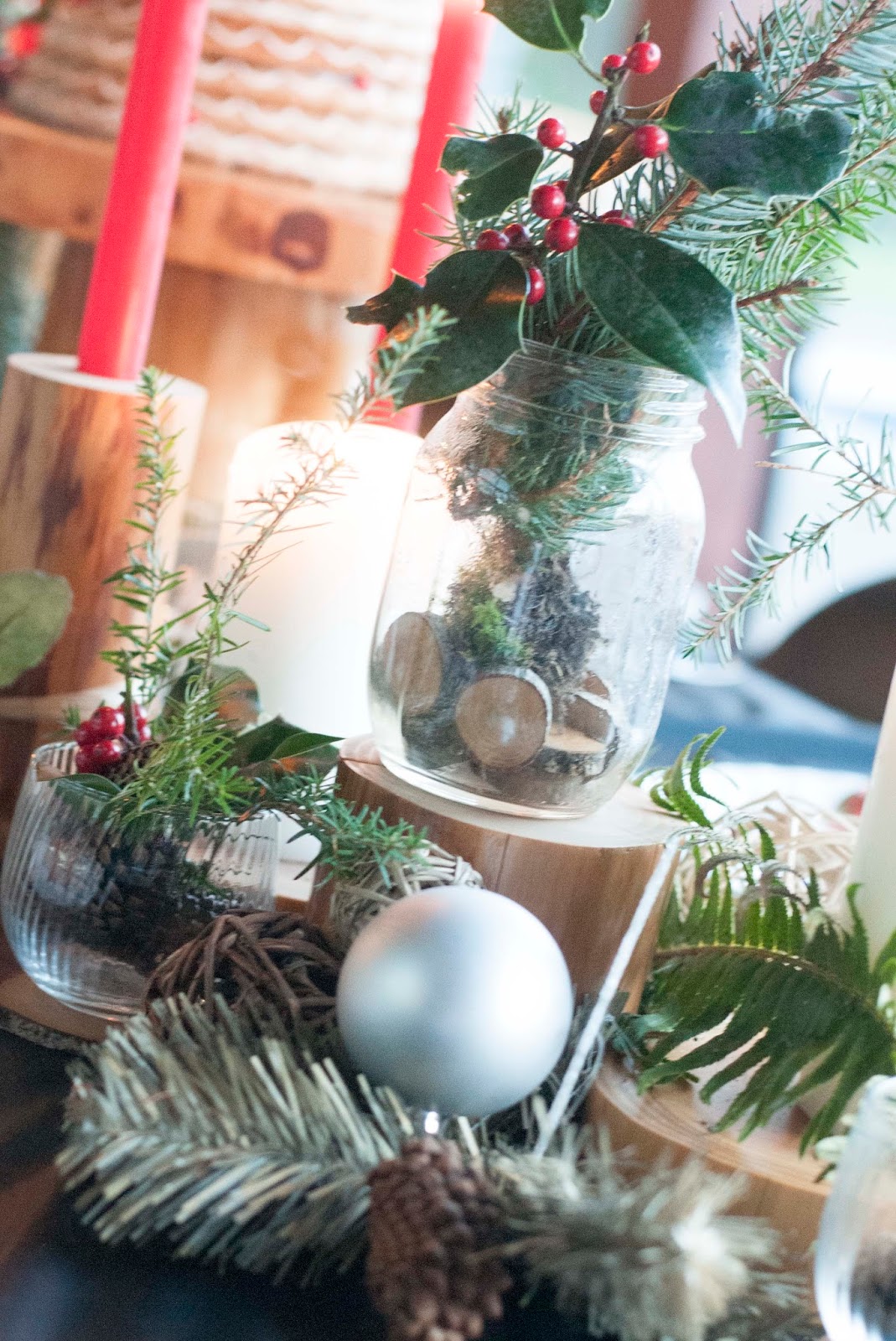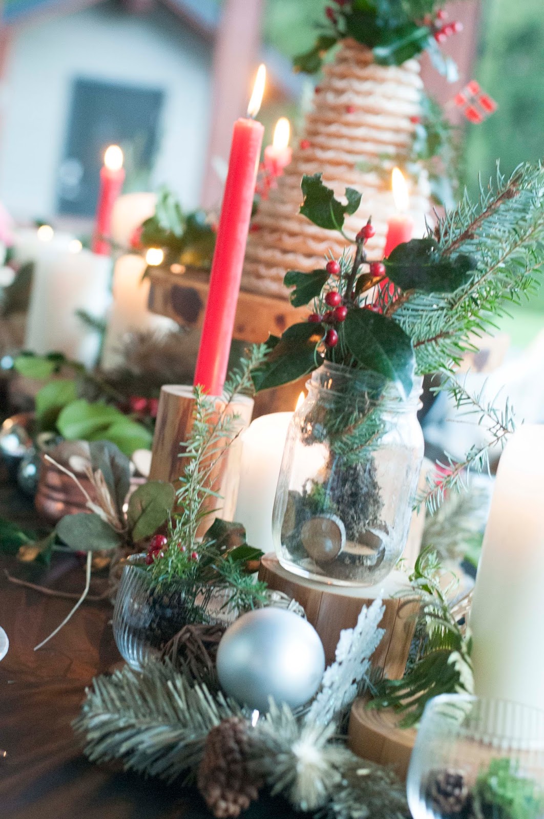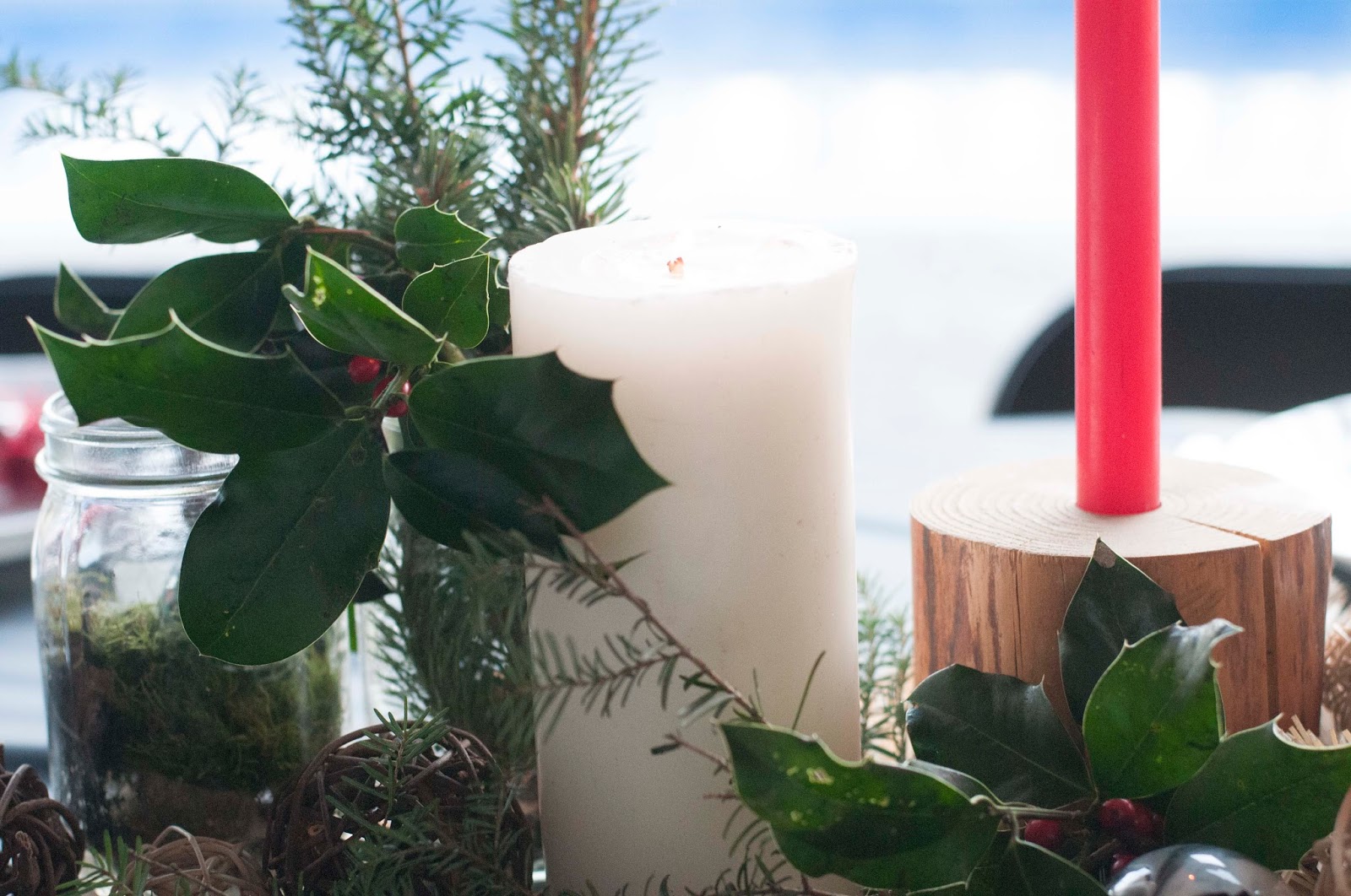 My sister in law and I created a little impromptu tablescape with holly, moss, ferns, and greens she collected from the property. The wooden cake stand, chargers, rounds, and candle holders were found just hanging out in the shop. Yes there is a shop on the property FULL of gorgeous tables and accents of different kinds made of wood by TJ’s dad, Peter.