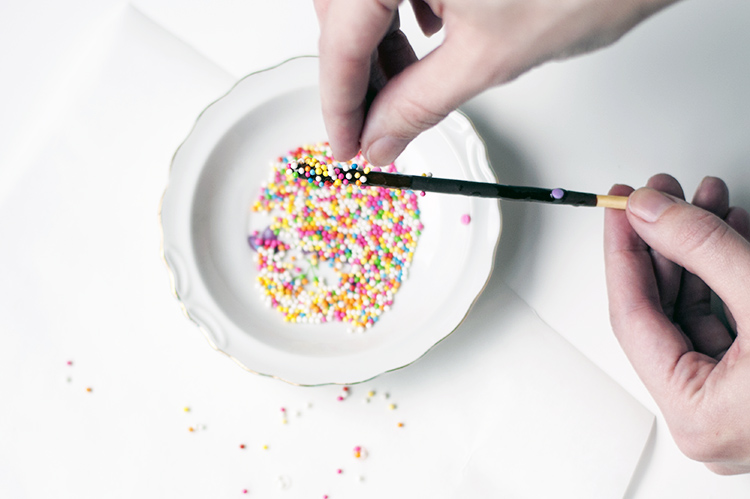 2. Take them out of the glass and roll, dip, and sprinkle on little candies and sprinkles.