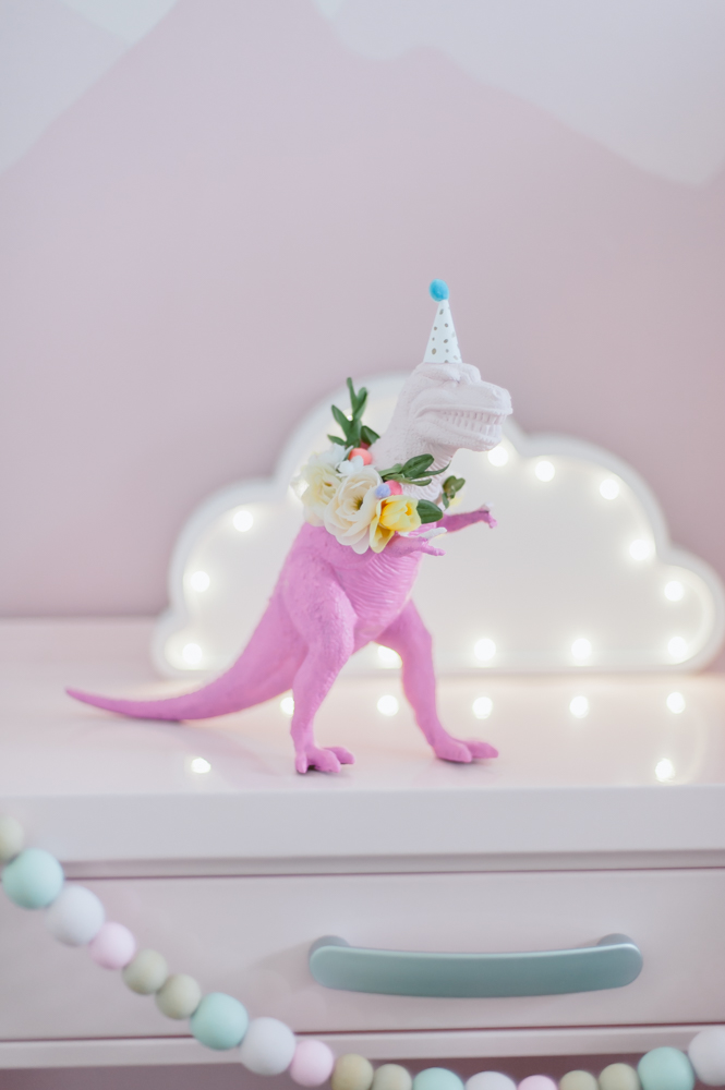 I bought these plastic dino’s at a thrift store for $1.99 each. I decided to give them a little girly flare by adding some paint, flowers and party hats.