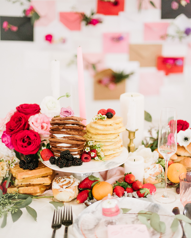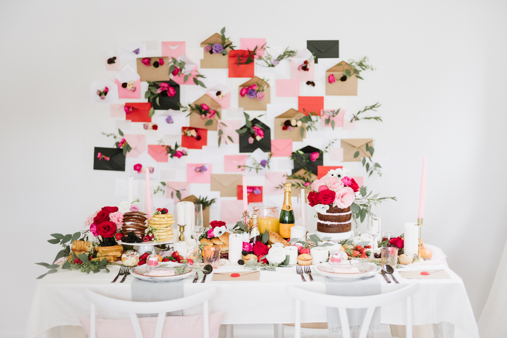 There is something so charming and romantic about a love letter. How fun would it be to give one to a friend, telling her how incredible you think she is?! We created this Galentine’s Day Brunch to inspire you to invite some of your favourites over and show them some love. My friend Sarah, lucky for me, is the brilliant cook behind Buona Sarah. She made delicous pancakes using her favourite recipe and brought them to brunch. Get the recipe here, and take a look at all the other delicious recipes on her blog while you’re at it. Yum. Nat and I put together this spread of brunch goodness, including fresh baked cinnamon roles and a chocolate cake filled with strawberry ganache.