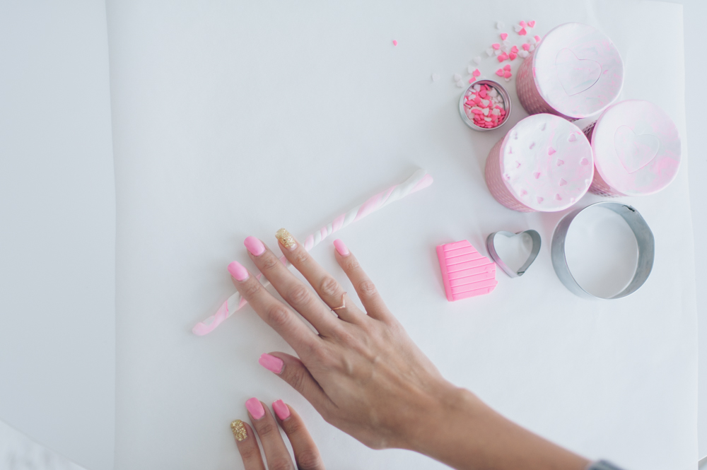You can leave them plain or make different designs. For two of them, we lightly pushed a heart shaped cookie cutter into the middle. For the other two, we placed little heart shaped sprinkles on the clay and then lightly rolled it out. Then