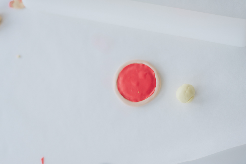 Take the tan clay and roll into a ball. Then using your rolling pin, roll out, not too thin. Using your shot glass, cut out your pizza crust.