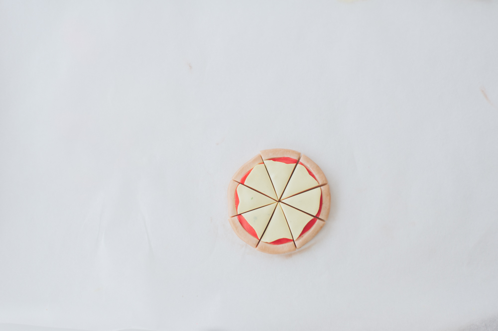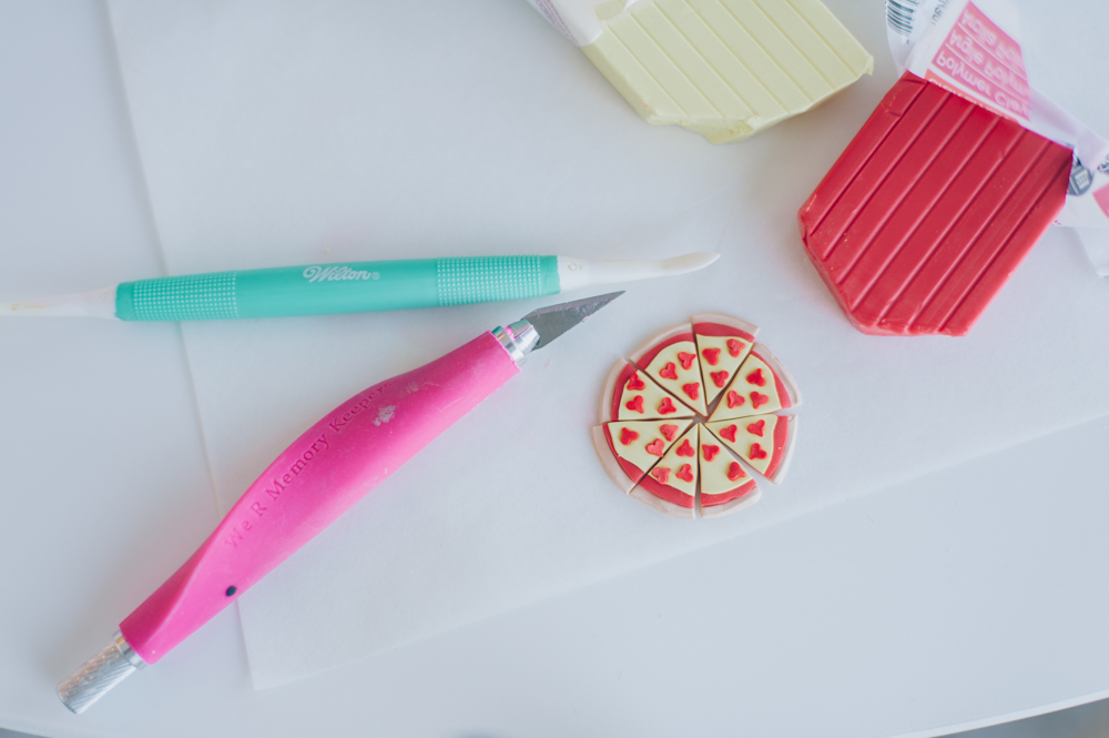 Put mini heart spinkles (or cut out pepperoni from red clay) onto the pizza slices