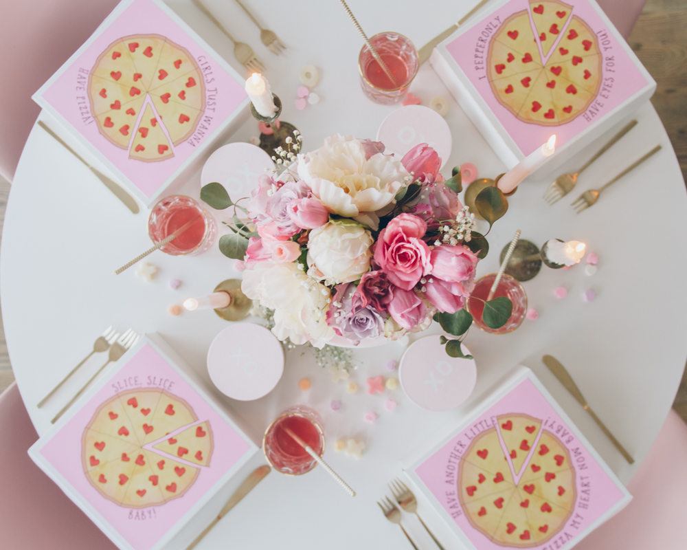 This Galentine shoot celebrates some of our favorite things, and creating and shooting it together was a labor of sisterly love (as usual..!). Ya’ll know we love cake, flowers, crafting, and pizza. So here it is, some crafty Valentine inspiration for ya’ll.