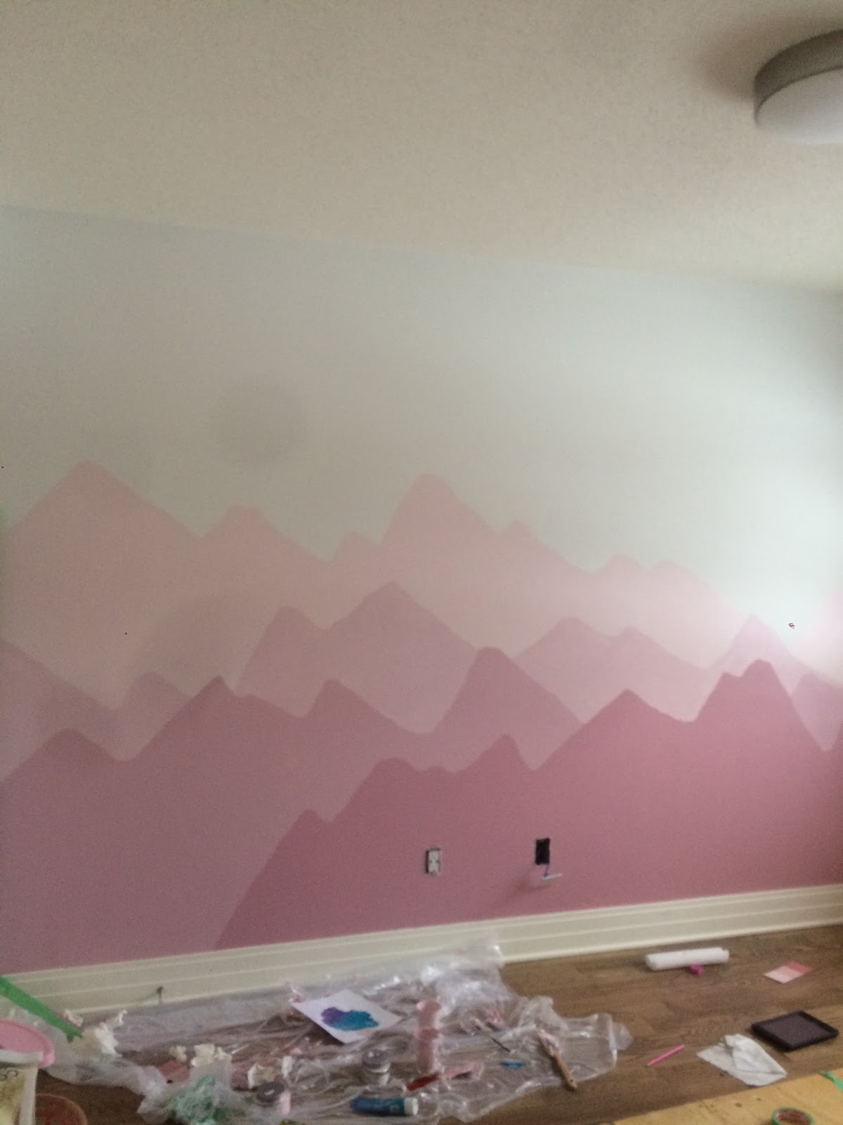 First I hand drew a sketch of what I wanted the mountains to look like. Then using a pencil, I drew it out on the wall. I started at the bottom with the darkest colour and free handed it with a brush.