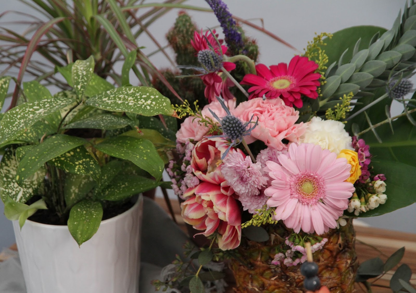 - Grab fresh florals and trim off the larger stems before carefully sticking them into the floral foam block. Arrange and add florals until you achieve your desired look.