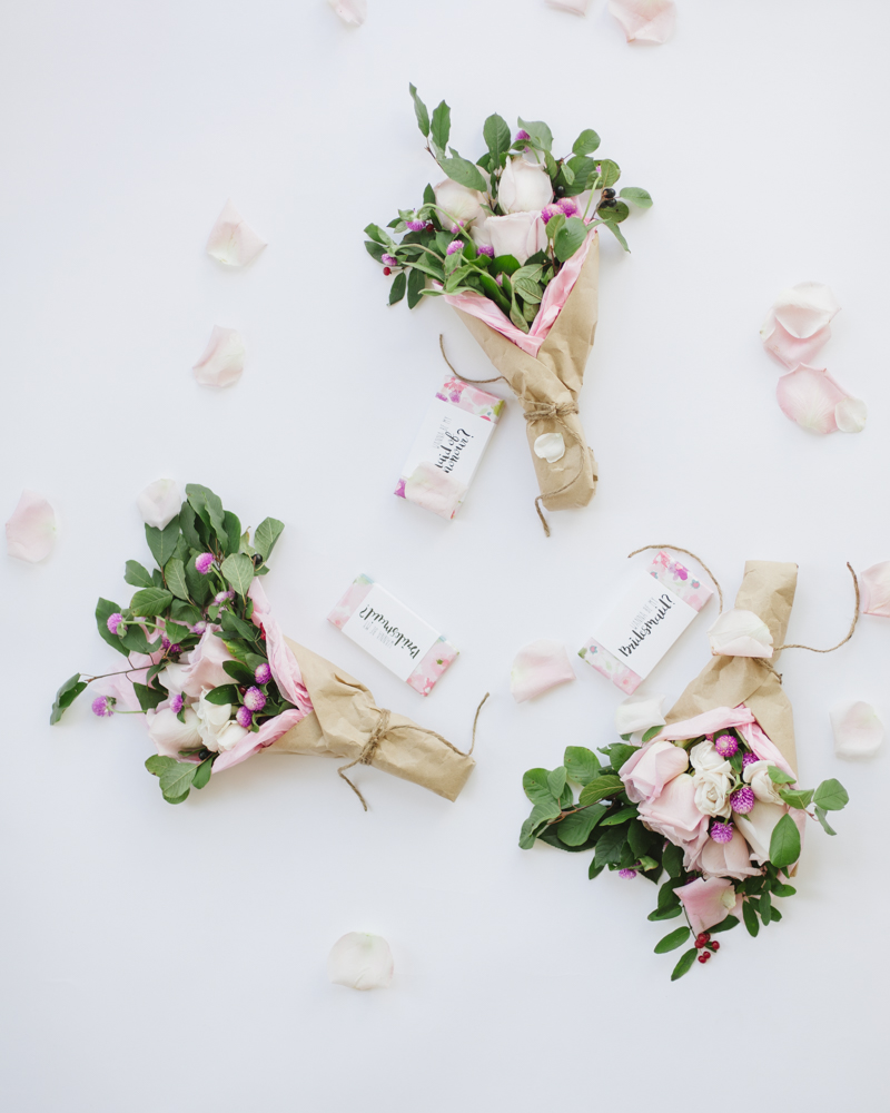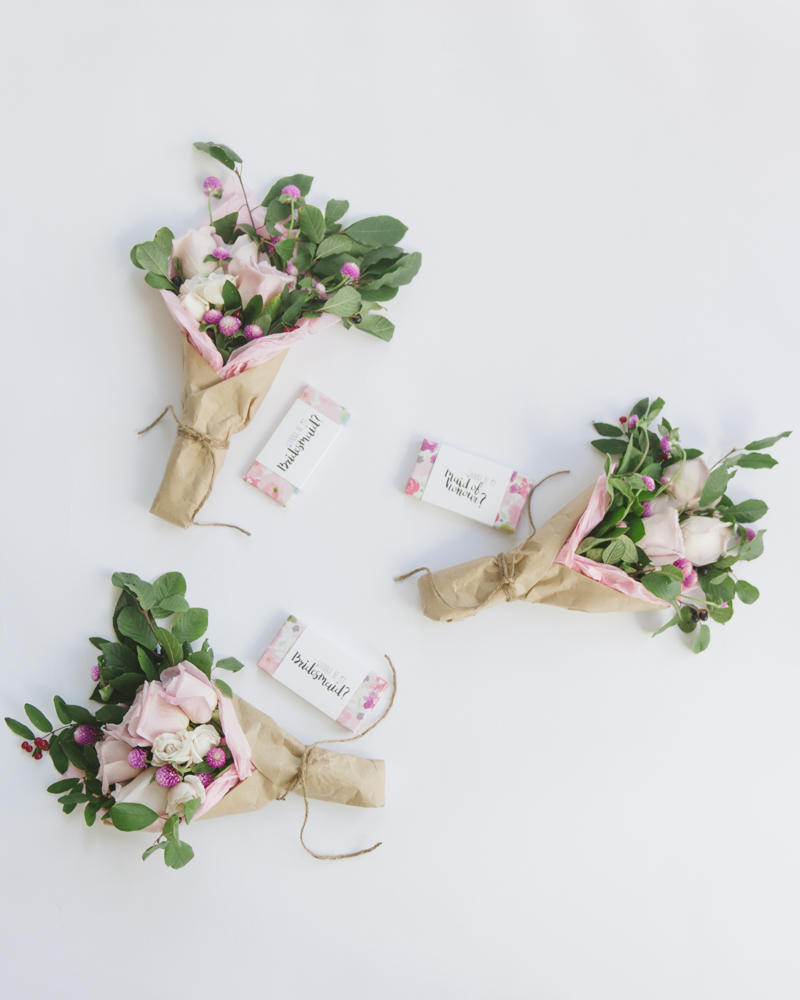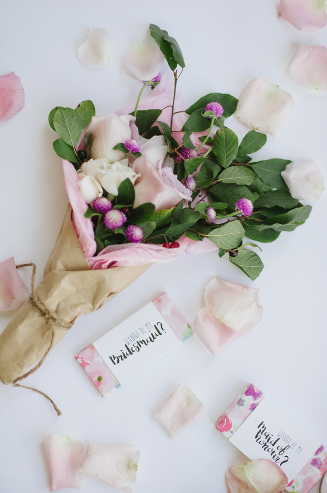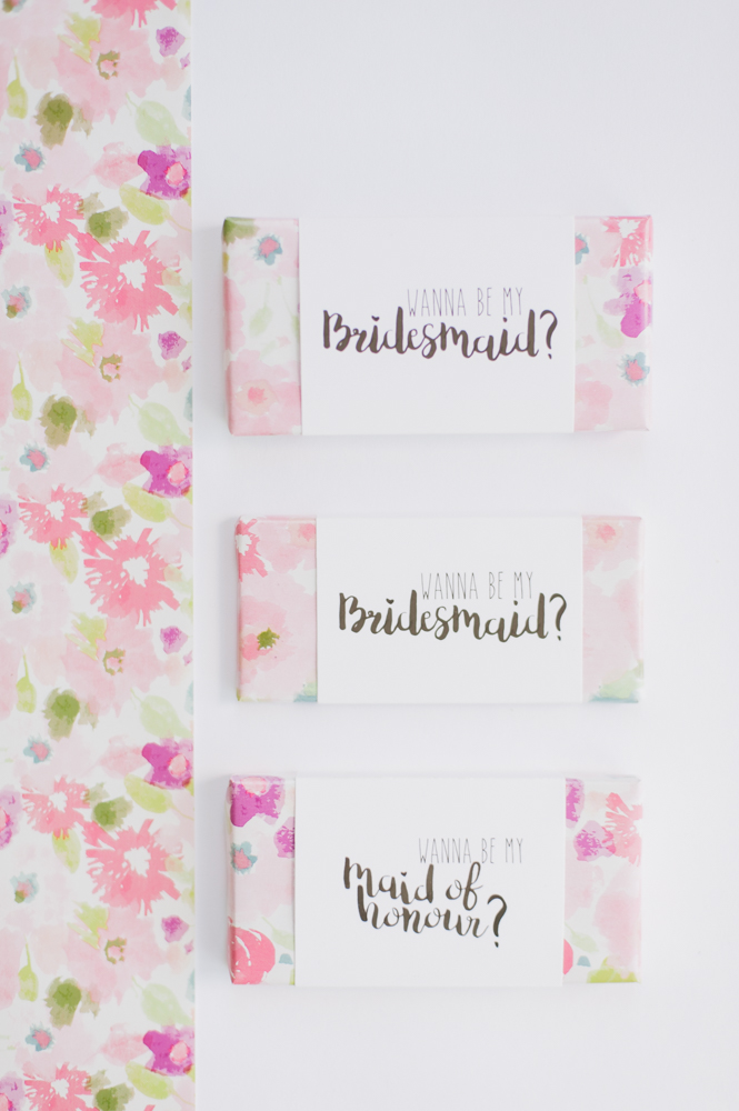I didn’t think I wanted a bridal party. It seems strange to pick my favorite women to be a prominent part of our wedding day and leave others out. Then I thought it would be great to have my closest 15 girls as part of our bridal party. In hindsight, not my best idea. So I decided to ask my two sisters Natalie and Bee, and my two best friends Sarah and Sarah. I gave them their favorite chocolate bars (and Reese bites!) wrapped in some pretty paper from the dollar bins at Michaels. We also made this cute “Wanna be my Bridesmaid?” printable in case you or someone special you know is getting married and want to do something fun and different for your ladies!