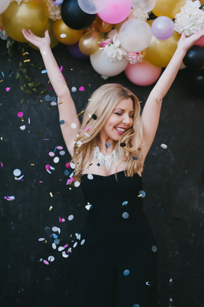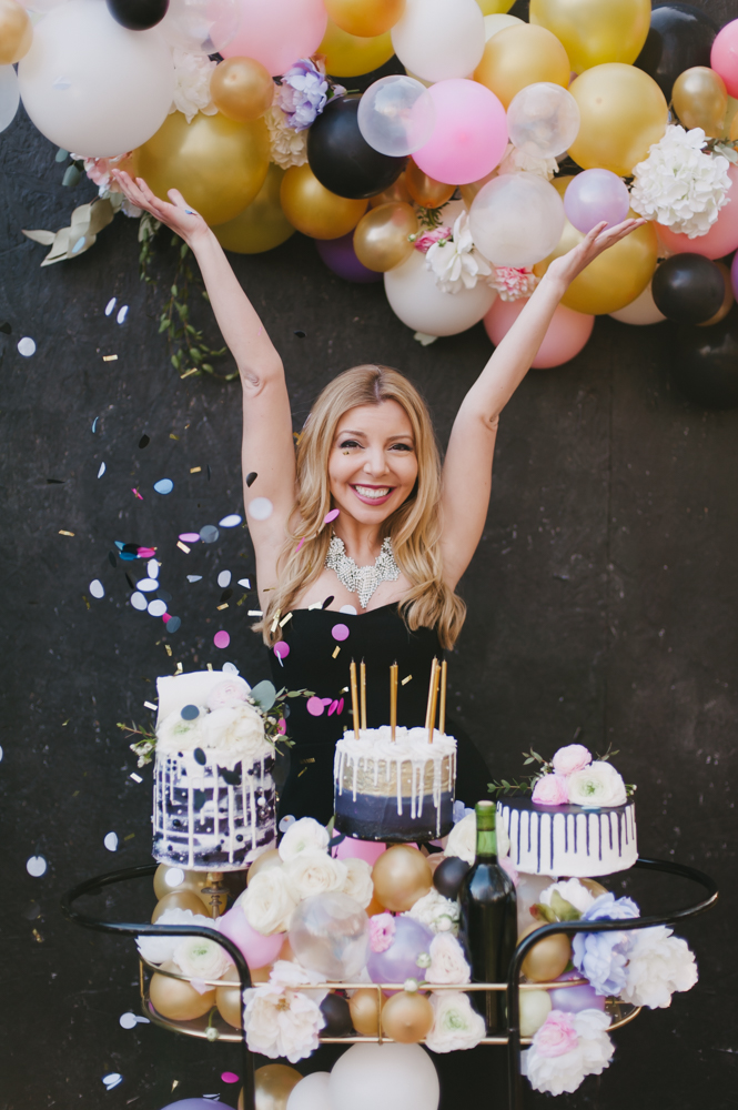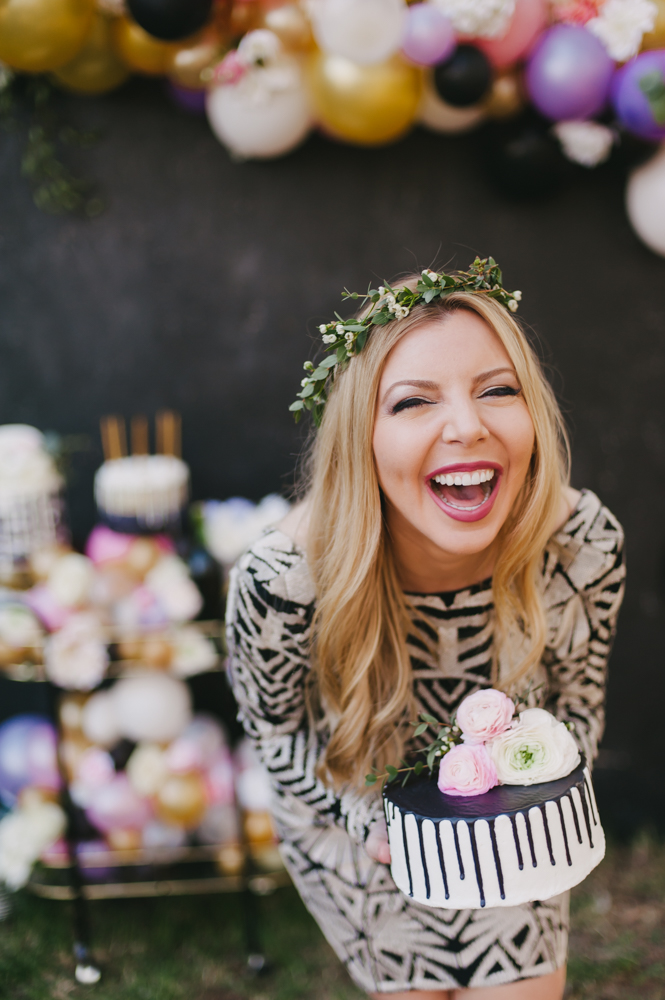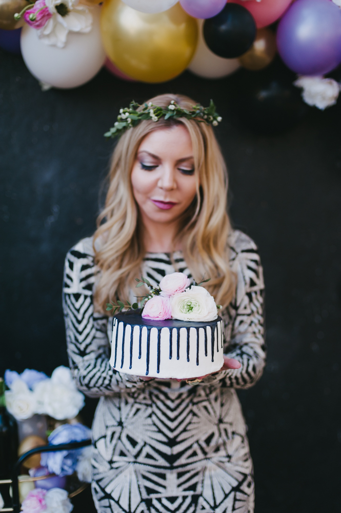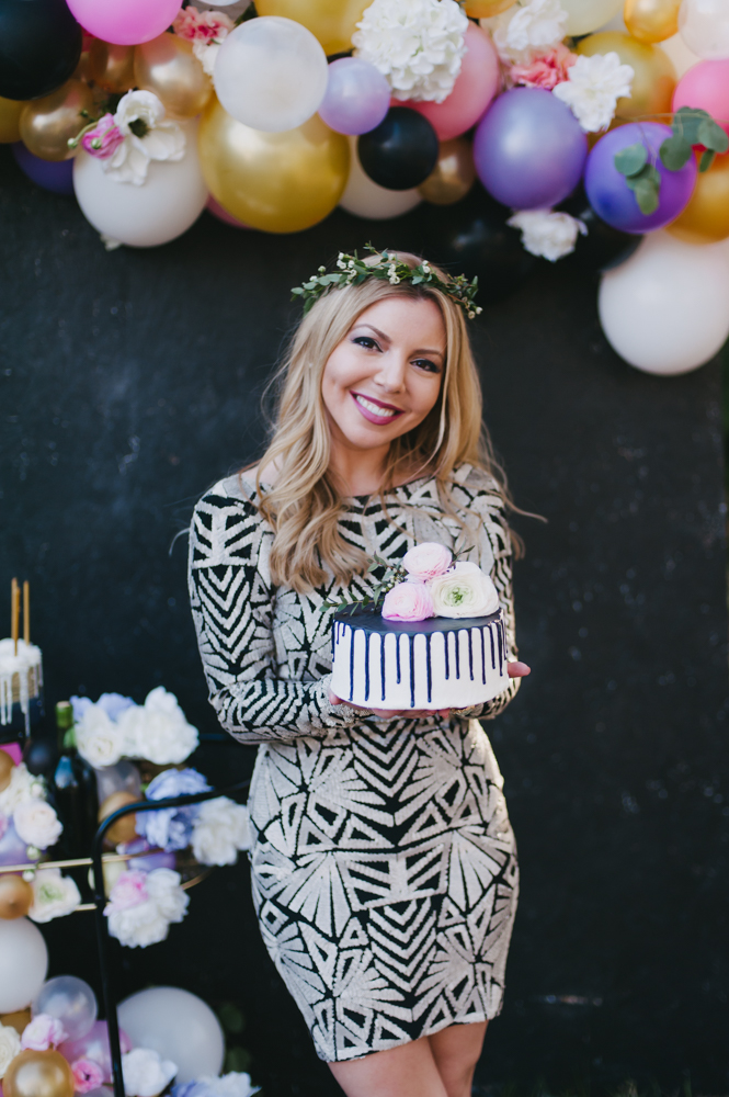 Christina is hands down one of our favorite clients. This is her second styled shoot with us, and she’s all about them build-a-cakes. She asked Nat and I to create a fun concept for her 30th birthday photos. With help from the boys we made this free standing 6′ wall styled with a balloon arch inspired by The House That Lars Buit (they featured us it in a post!). Christina loves black, white and gold, but we didn’t want the images to look too NYE-ie, so we added splashes of color.