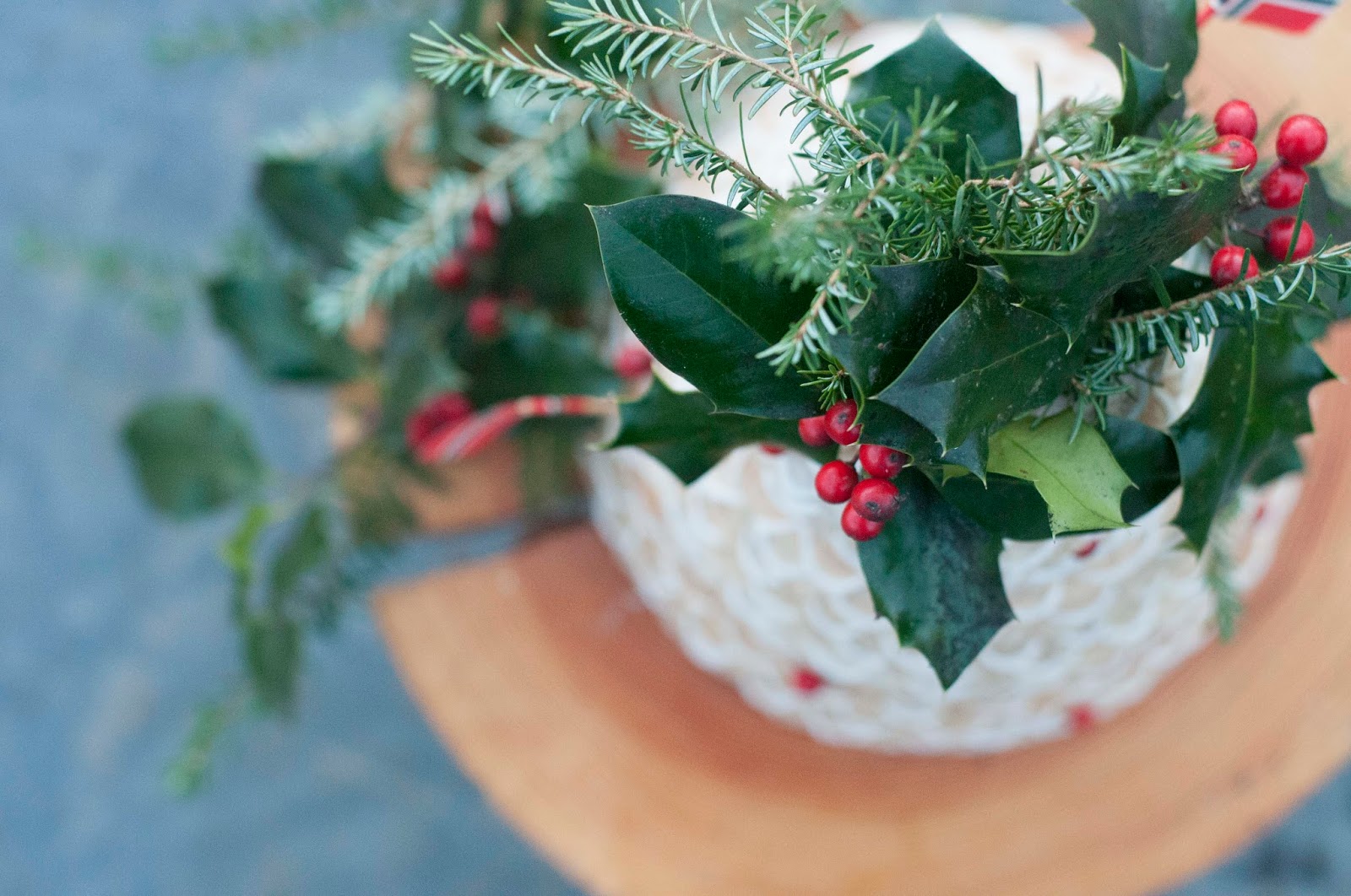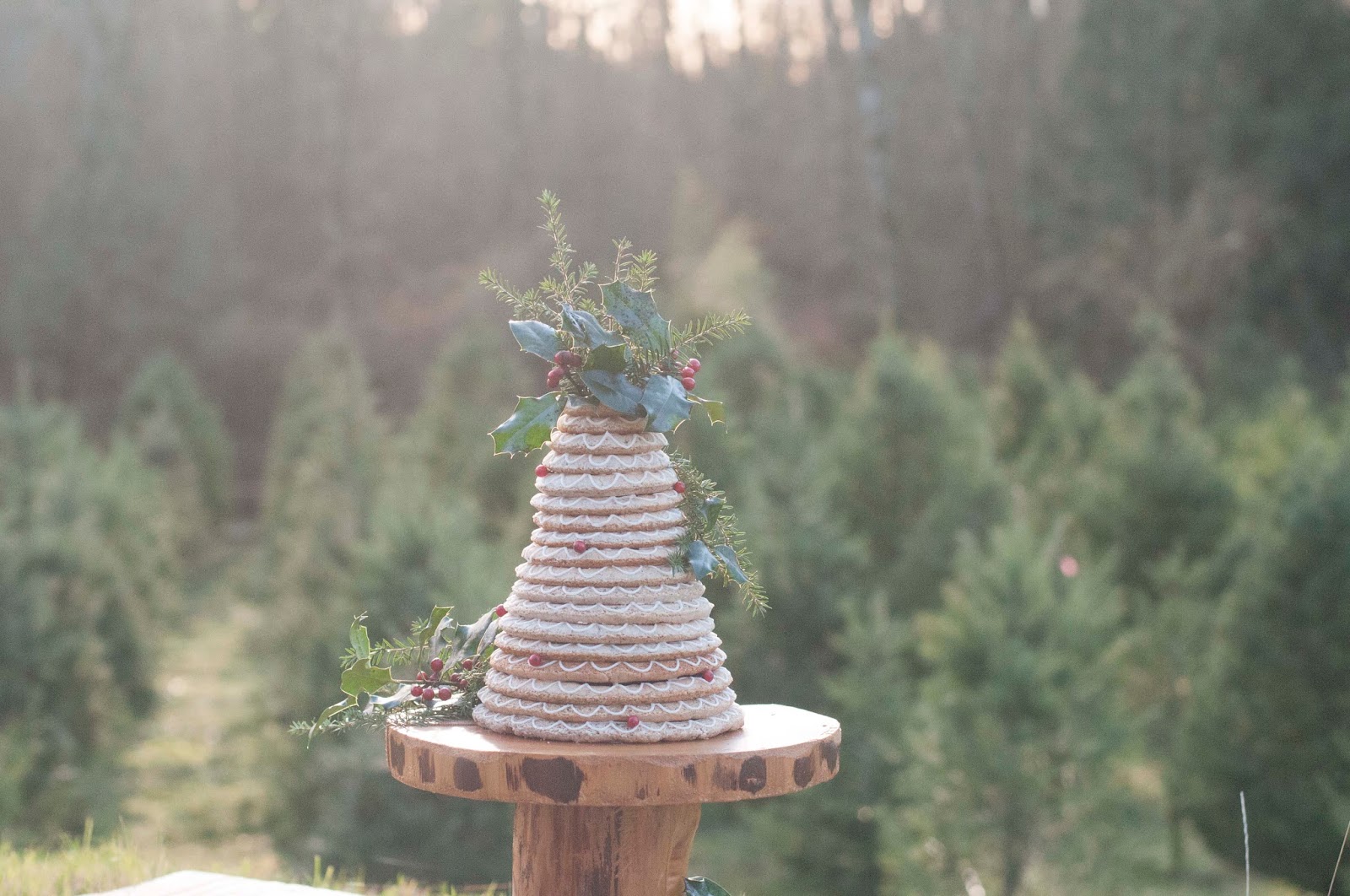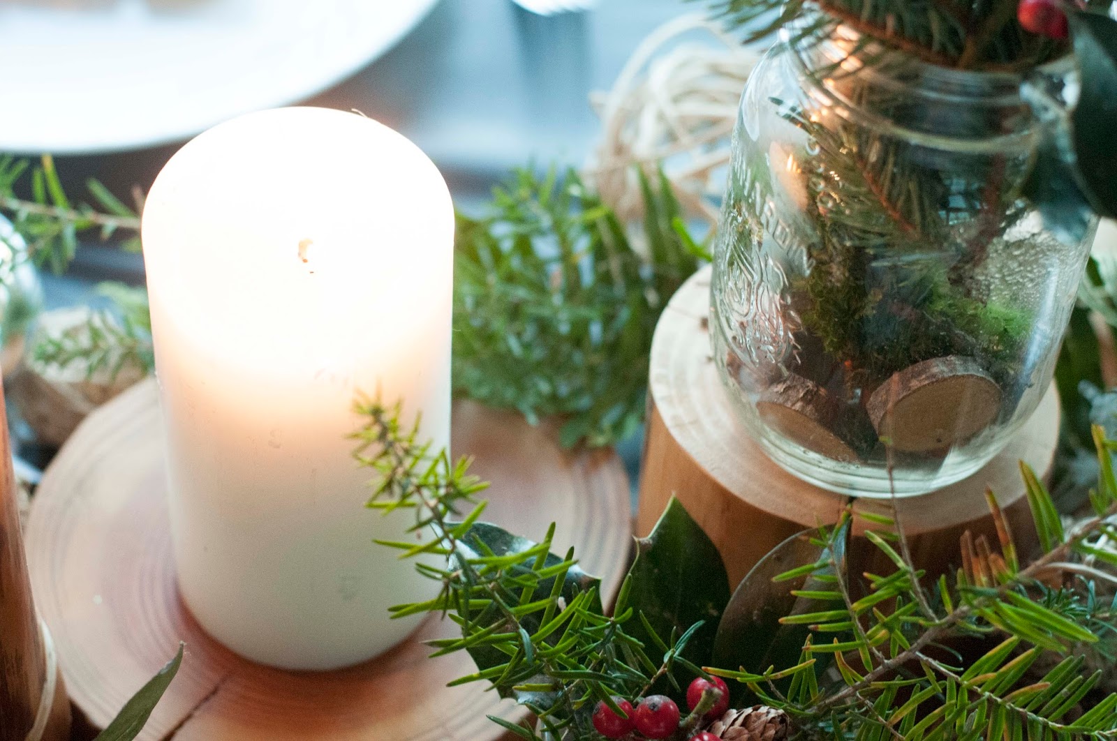 My sister in law and I created a little impromptu tablescape with holly, moss, ferns, and greens she collected from the property. The wooden cake stand, chargers, rounds, and candle holders were found just hanging out in the shop. Yes there is a shop on the property FULL of gorgeous tables and accents of different kinds made of wood by TJ’s dad, Peter.