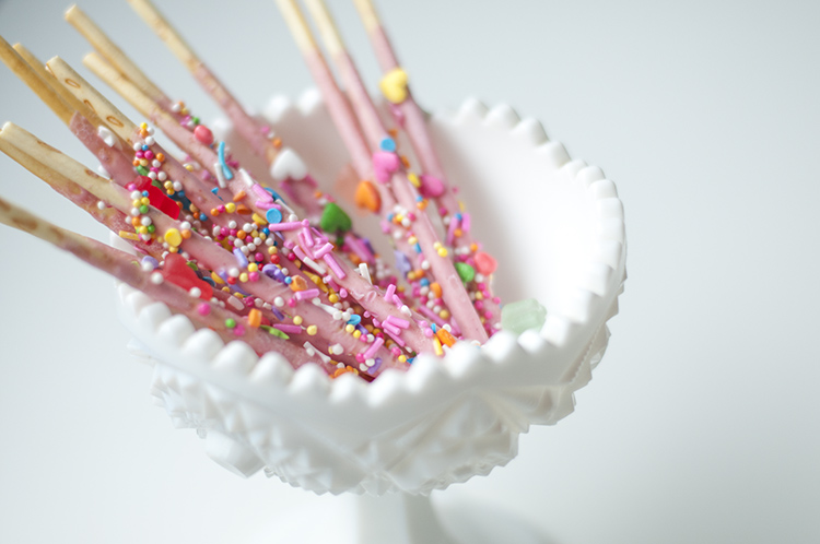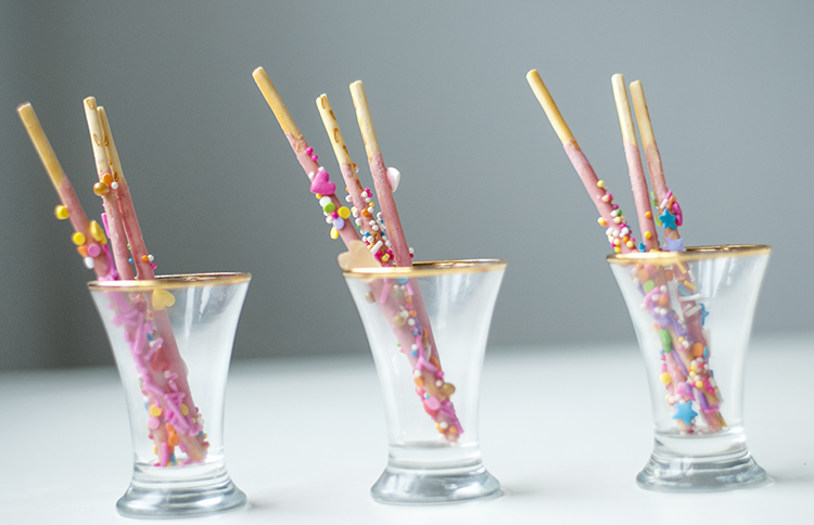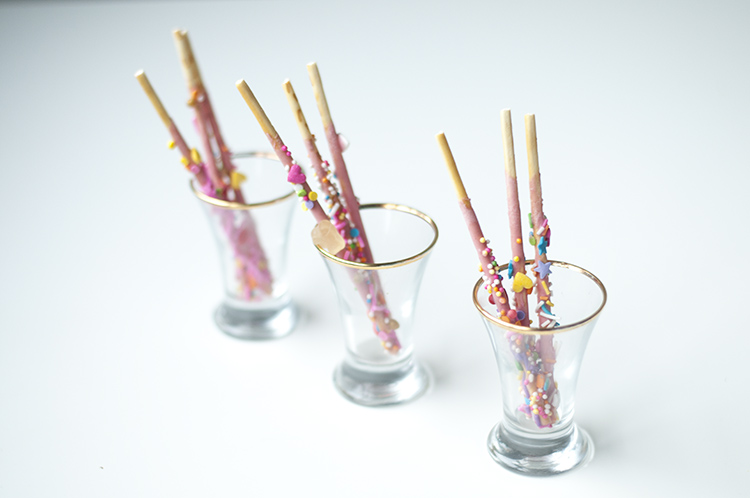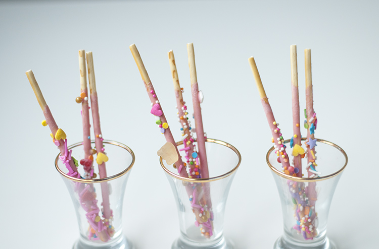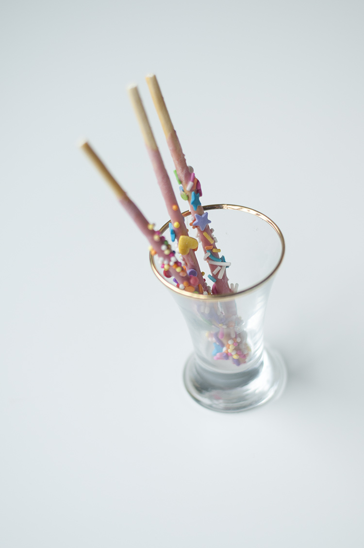 2. Take them out of the glass and roll, dip, and sprinkle on little candies and sprinkles.