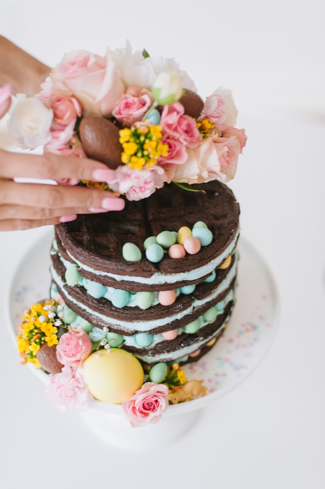 4. In every second layer we added a bunch mini eggs in the waffle grooves and around the outside.