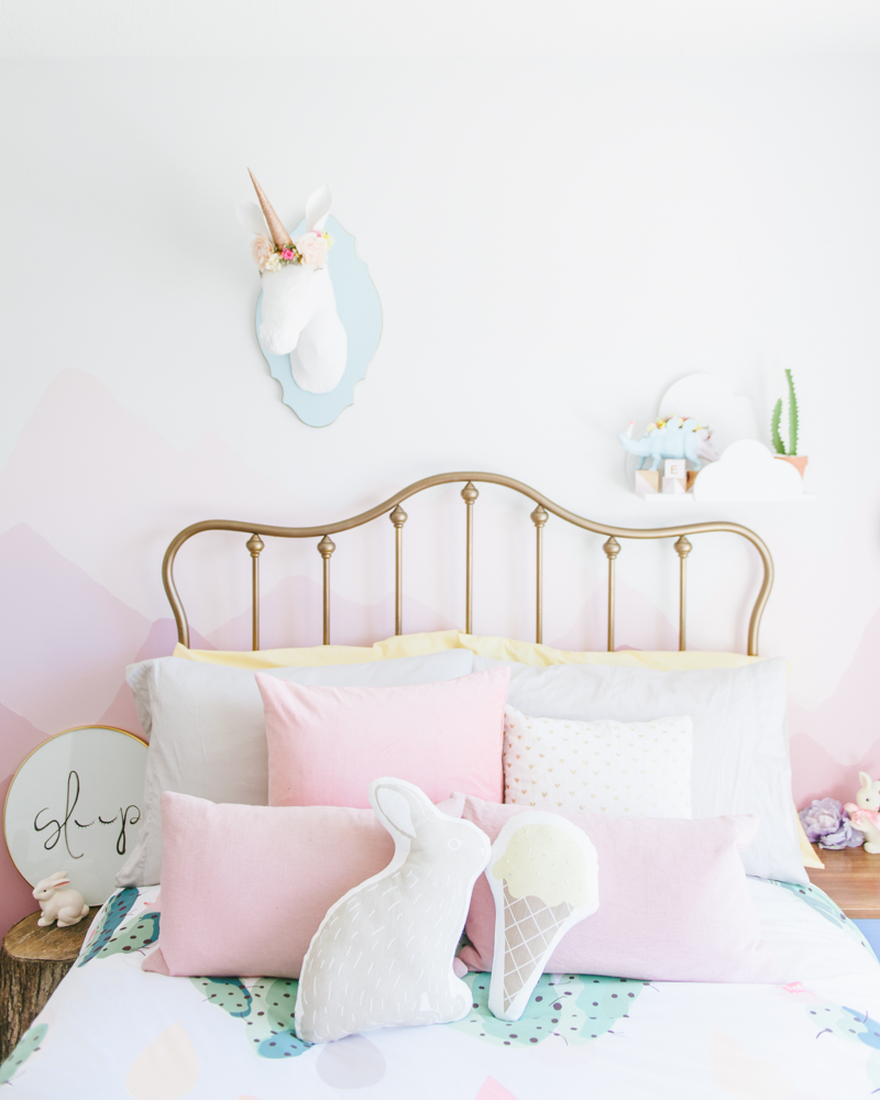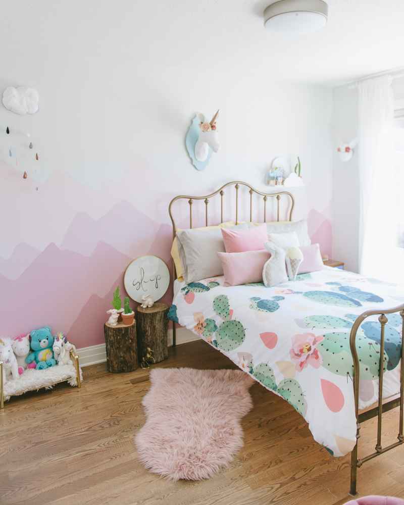 FINALLY! The big reveal of Ellia’s room all completed! We were inspired by our favourite place, California with a hint of whimsy. The hand painted mountain mural reminds us of driving through Southern California at golden hour, and the duvet cover of all the incredible plants that grow all over the place. We have posted a bunch of DIY tutorials from this room over the past few months and we are so happy we were able to make this room unique, fun and special for our fav girl!