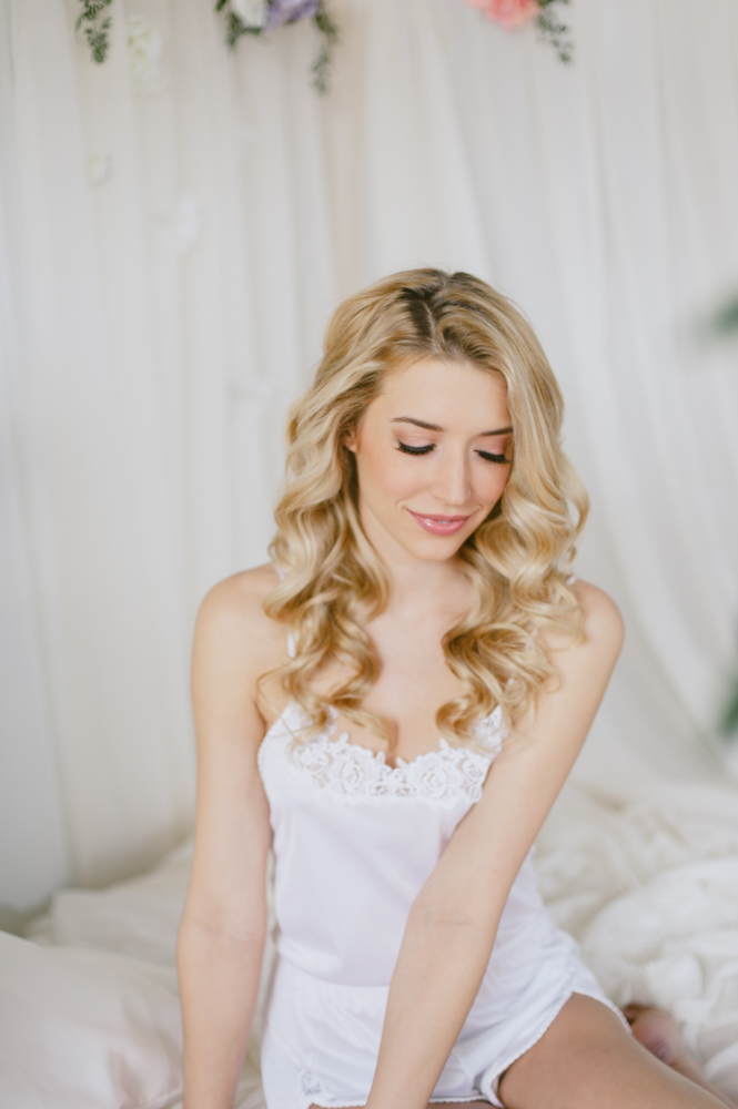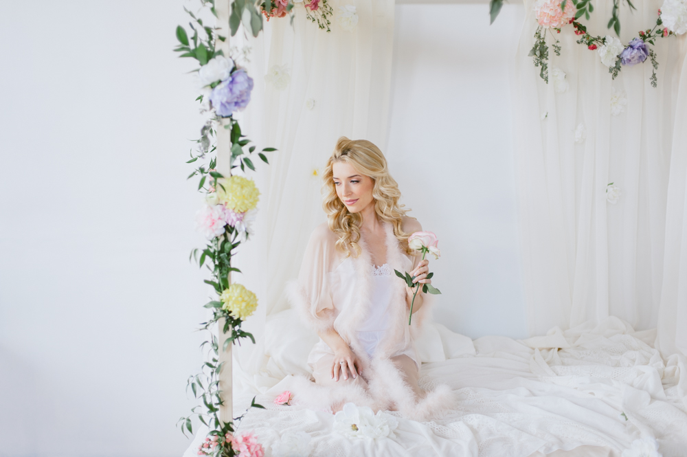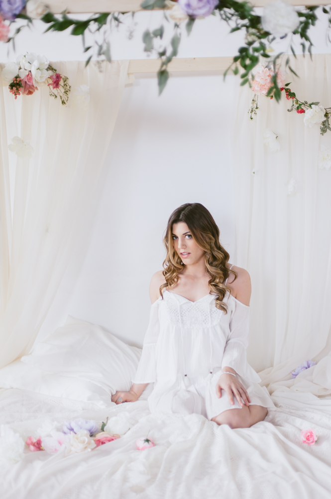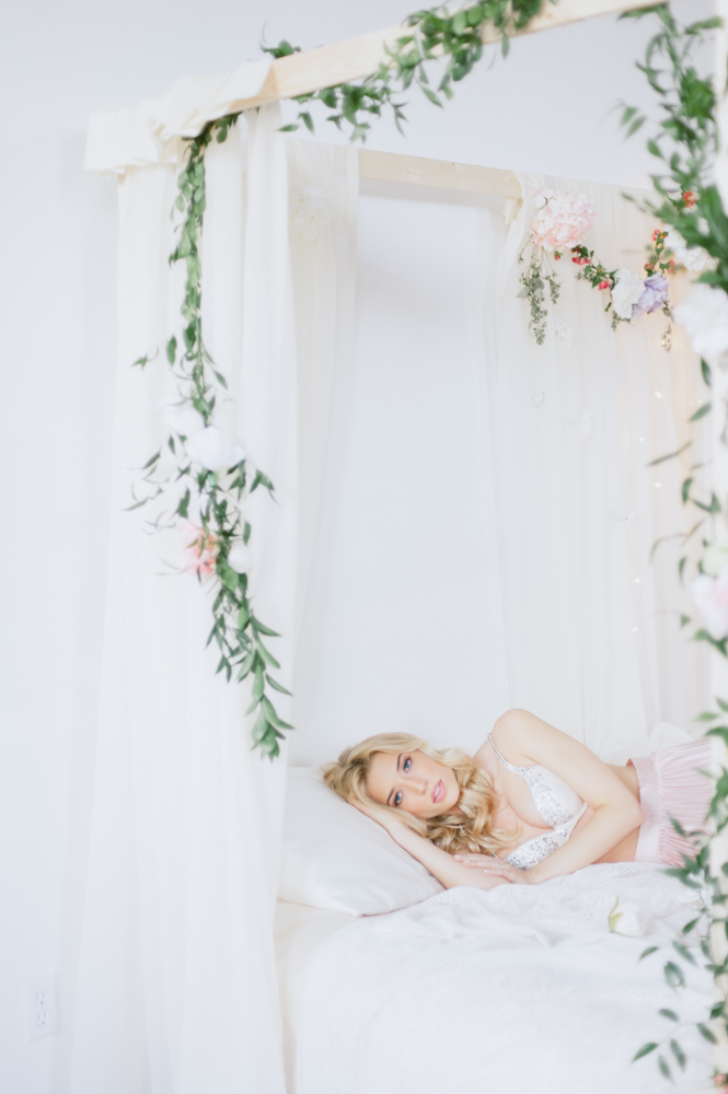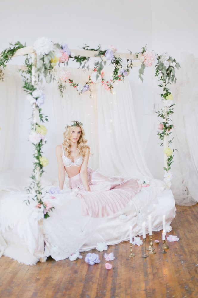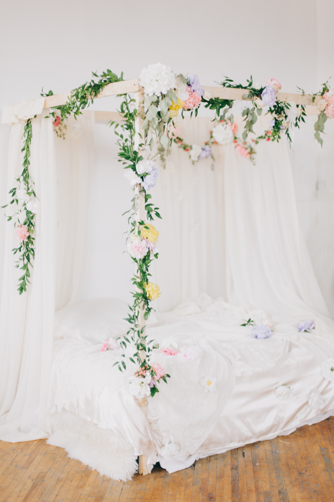Nat and I have been dreaming up this shoot for a while. We wanted to create something feminine, soft, sexy and colorful that would encourage our guests to feel like a bombshell princess for the afternoon. My handy (and handsome) boyfriend TJ build this bed in an hour in our studio. Yah, he’s the bomb. We are lucky to have a gorgeous space in Toronto to create in. The studio is shared with group of artists I am a part of who study acting in the evenings. It’s a big, bright space with so many great shooting spots.