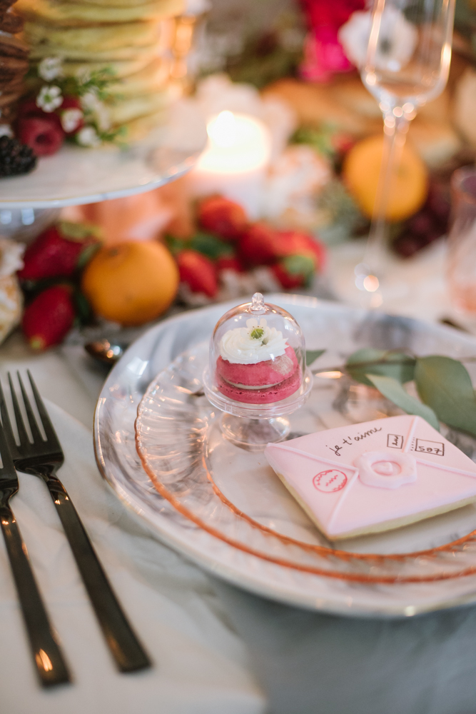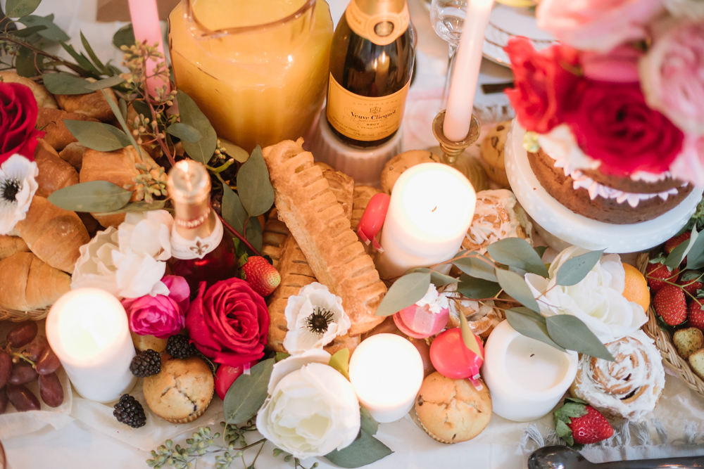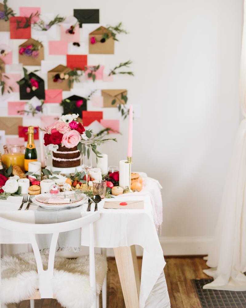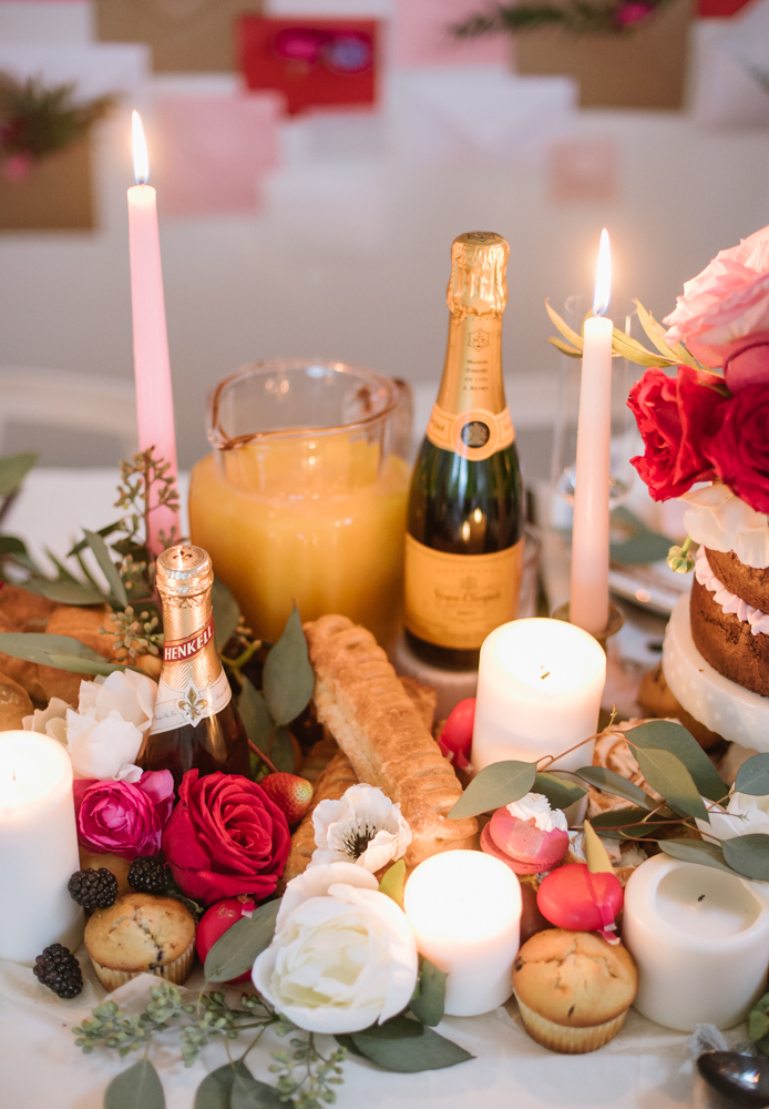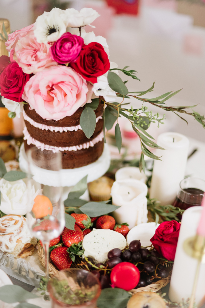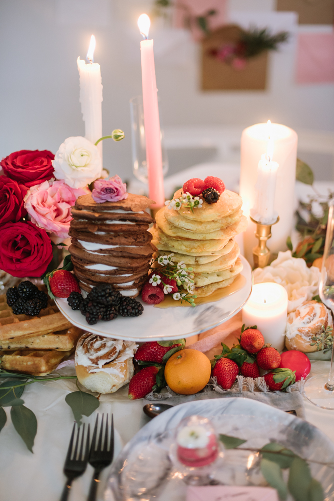 There is something so charming and romantic about a love letter. How fun would it be to give one to a friend, telling her how incredible you think she is?! We created this Galentine’s Day Brunch to inspire you to invite some of your favourites over and show them some love. My friend Sarah, lucky for me, is the brilliant cook behind Buona Sarah. She made delicous pancakes using her favourite recipe and brought them to brunch. Get the recipe here, and take a look at all the other delicious recipes on her blog while you’re at it. Yum. Nat and I put together this spread of brunch goodness, including fresh baked cinnamon roles and a chocolate cake filled with strawberry ganache.