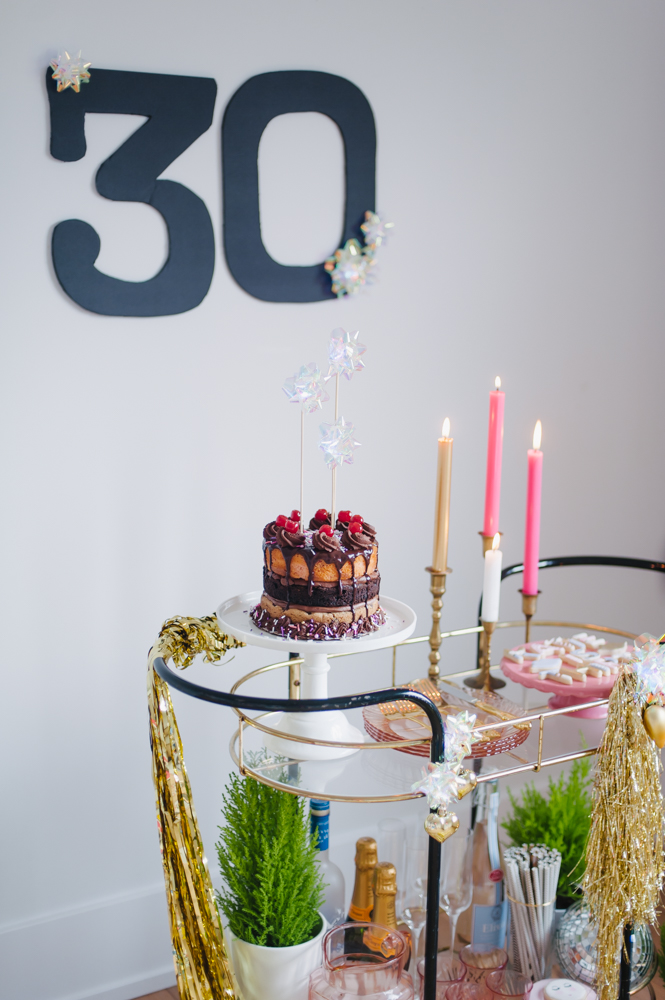 Nat also decided to do a little styled bar cart to celebrate. The focal point was a decadent, 3 layer – cherry chip cake, brownie, chocolate chip cookie with ganache filling and drip cake, topped with spinkles and cherries. She made a giant foam board 30 and used elements that she had, such as pillar candles, long gold tinsel, disco ball, pink depression glass, gold cutlery and some cute trees to add a pop of colour. And of course there was some really great champagne. She made some simple and cute cake toppers by sticking iridescent bows from the dollarstore on skewers.
