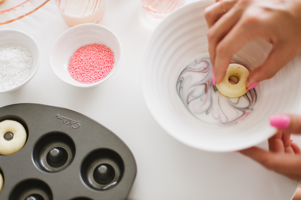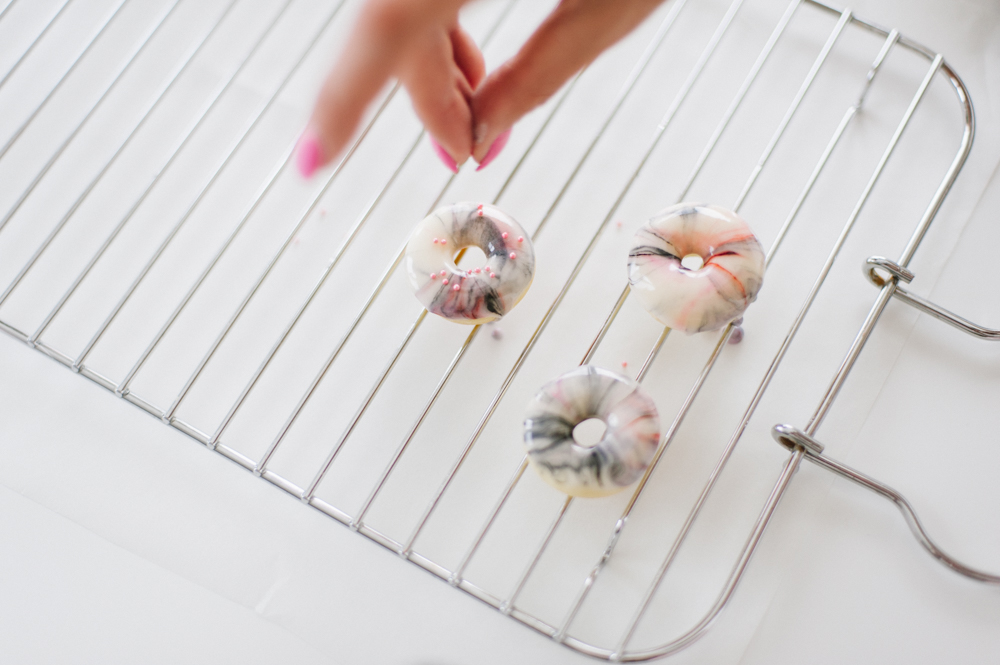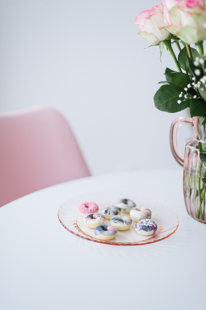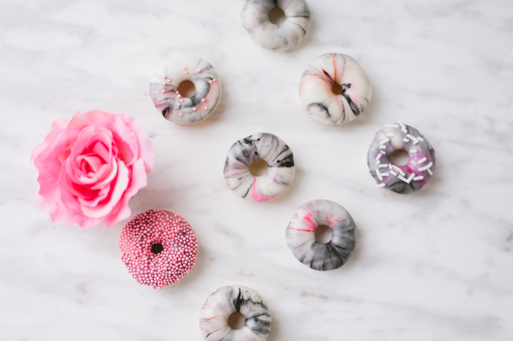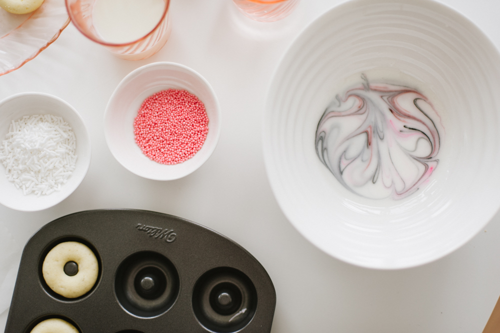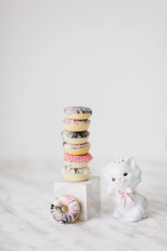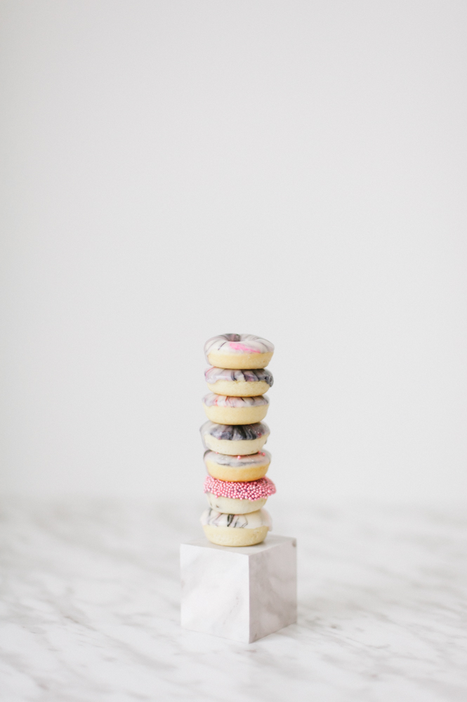 One of the aspects of the new house that I was super excited about was the marble countertops. We had Quartz in the last two houses, but really wanted to switch it up this time and I really love the look of it! I always love baking, but baking something as cute as donuts is extra rewarding. So I had these mini donuts and was trying to think of how I wanted to ice them, and they were just there, sitting on the marble countertops and I had this AH HA! moment! So I whipped up some simple glaze and just went with it and was so thrilled at how awesome they turned out. A lot of you guys asked for a tutorial so here it is!