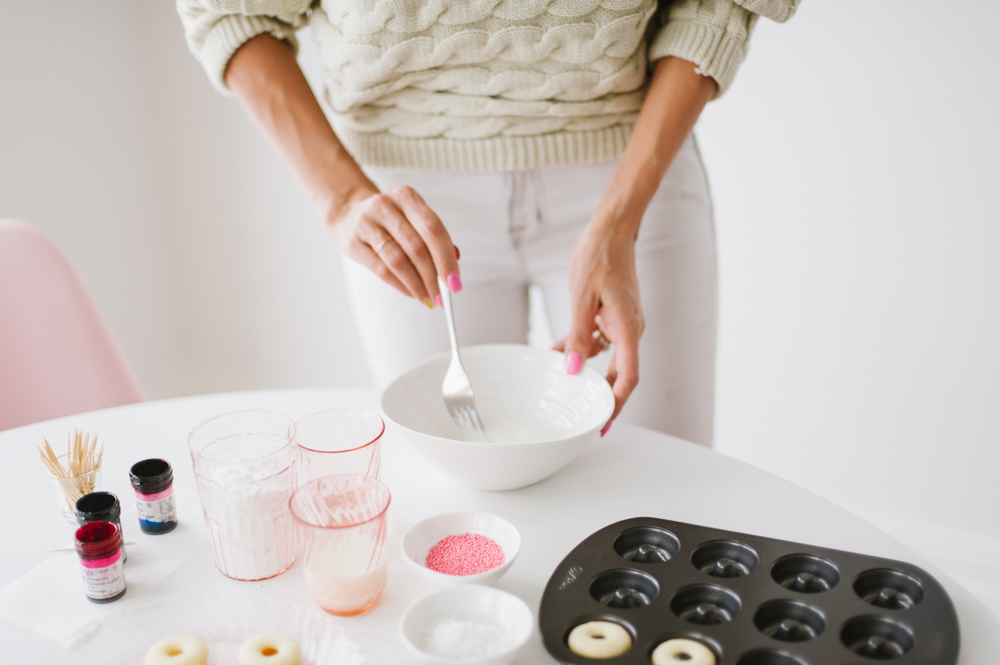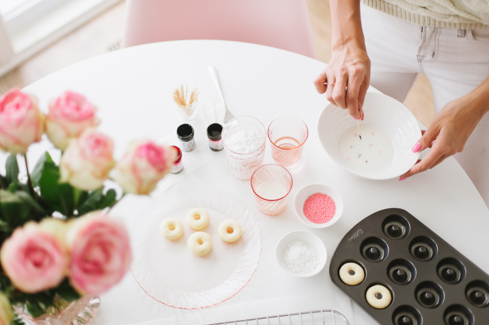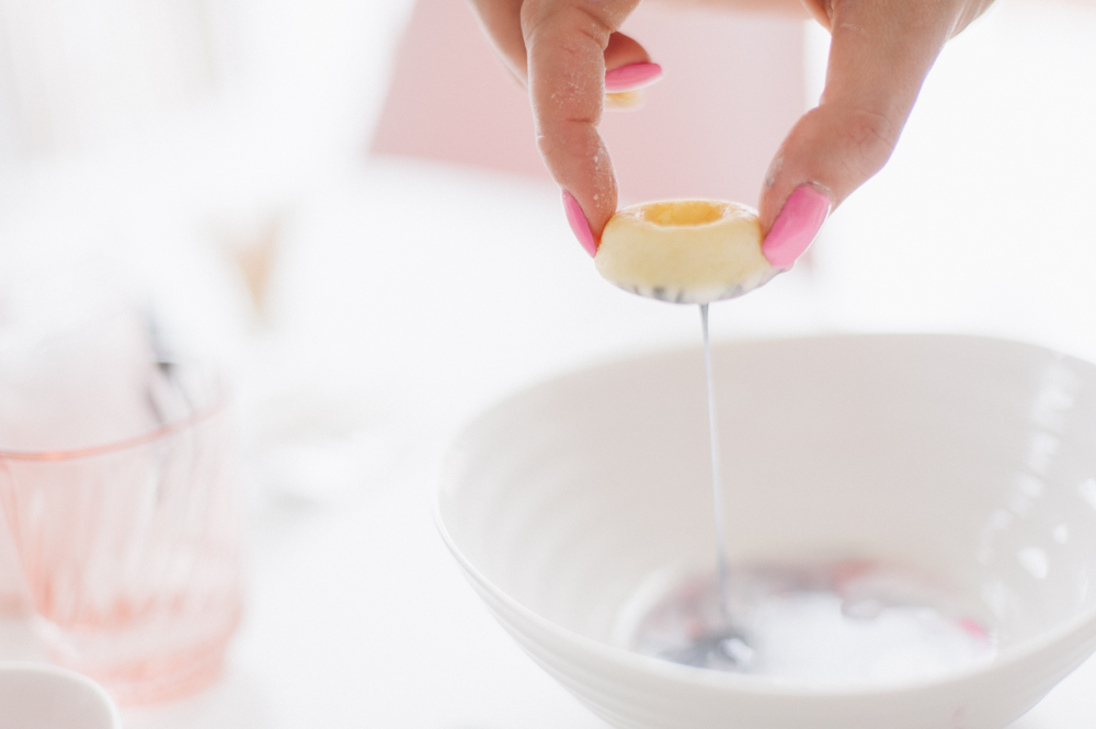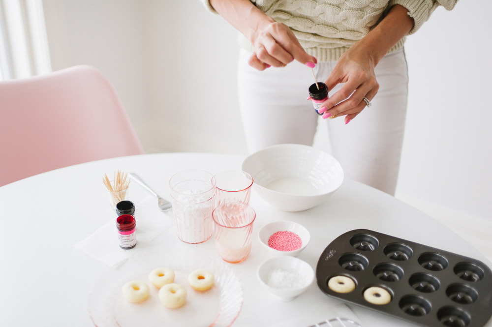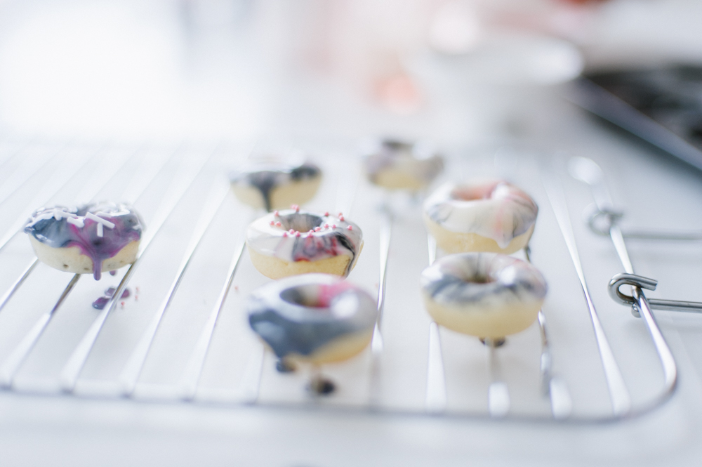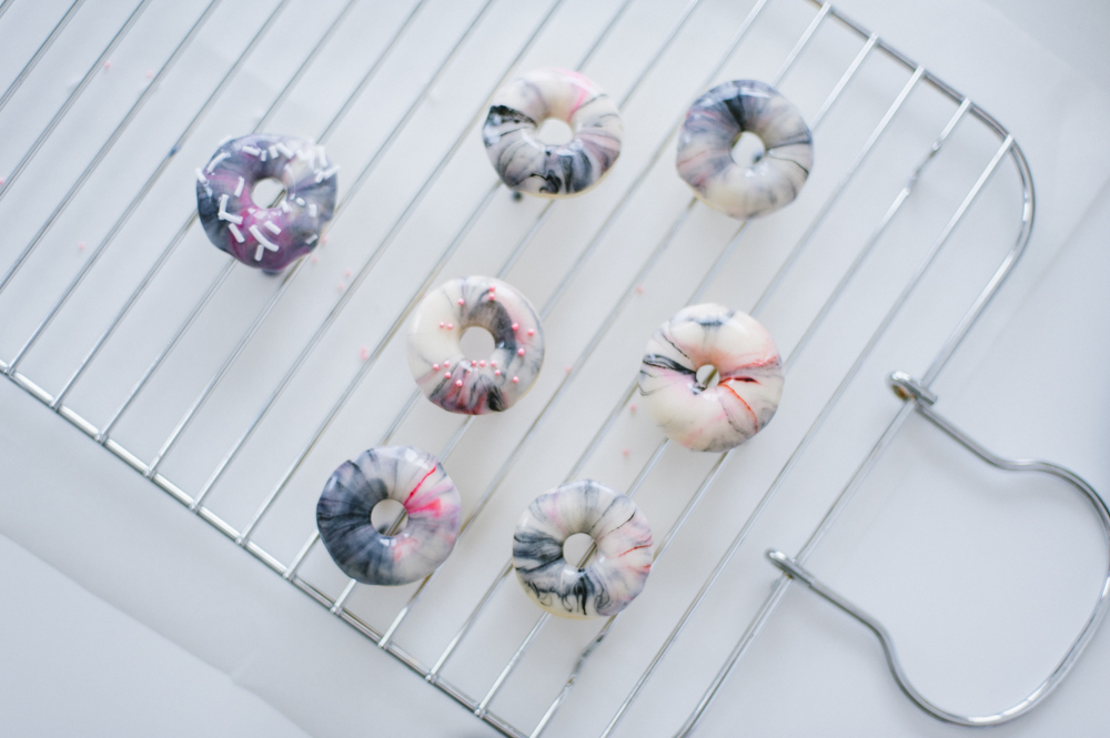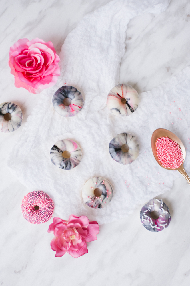 One of the aspects of the new house that I was super excited about was the marble countertops. We had Quartz in the last two houses, but really wanted to switch it up this time and I really love the look of it! I always love baking, but baking something as cute as donuts is extra rewarding. So I had these mini donuts and was trying to think of how I wanted to ice them, and they were just there, sitting on the marble countertops and I had this AH HA! moment! So I whipped up some simple glaze and just went with it and was so thrilled at how awesome they turned out. A lot of you guys asked for a tutorial so here it is!