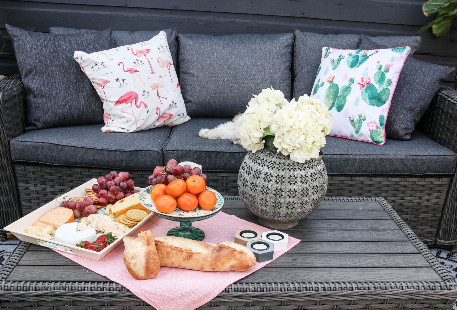 My weather resistant rugs and throw pillows make my heart happy. They compliment the tapestry, and transform the outdoor area into a cozy room. I have used a lot of colours here, but have stuck to a palette inspired by the cushions. I’m a sucker for pink, green, and blue together and decided on different shades of these colours.