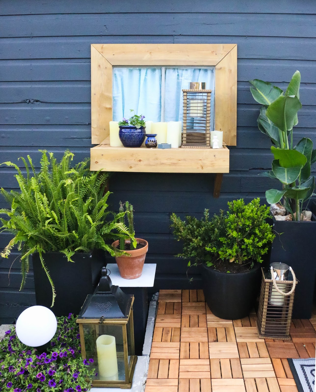 TJ built this shelf around the ugly old garage window, and I added a few cloths as “curtains” to pretty it up. Jysk’s selection of outdoor pots is also fab. They look heavy but they’re actually fairly light, and start as low as $19.99.