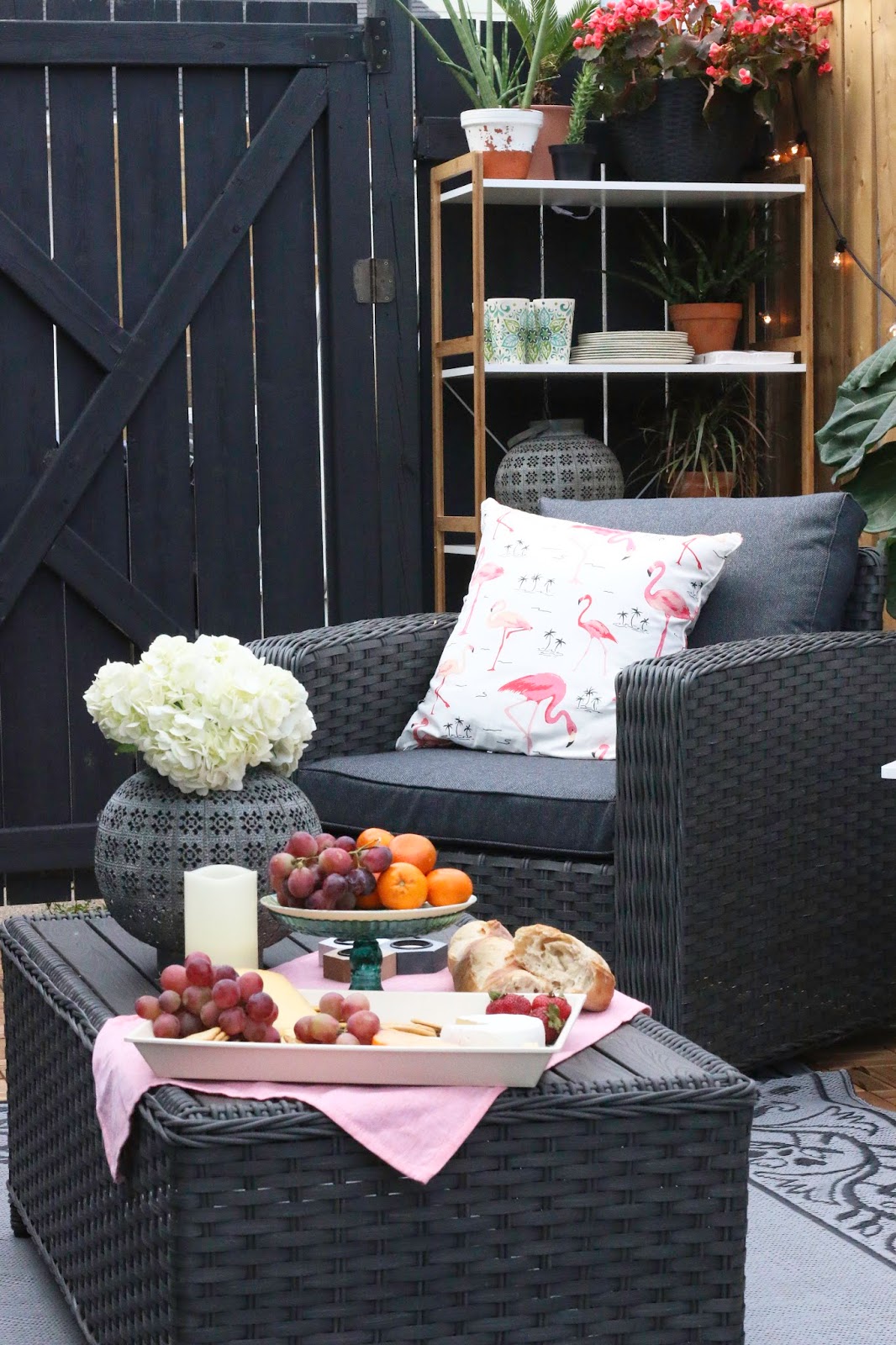 My side table is part of the same collection as the shelf, and although it’s also an indoor piece, It’s fun to bring it outside for entertaining.