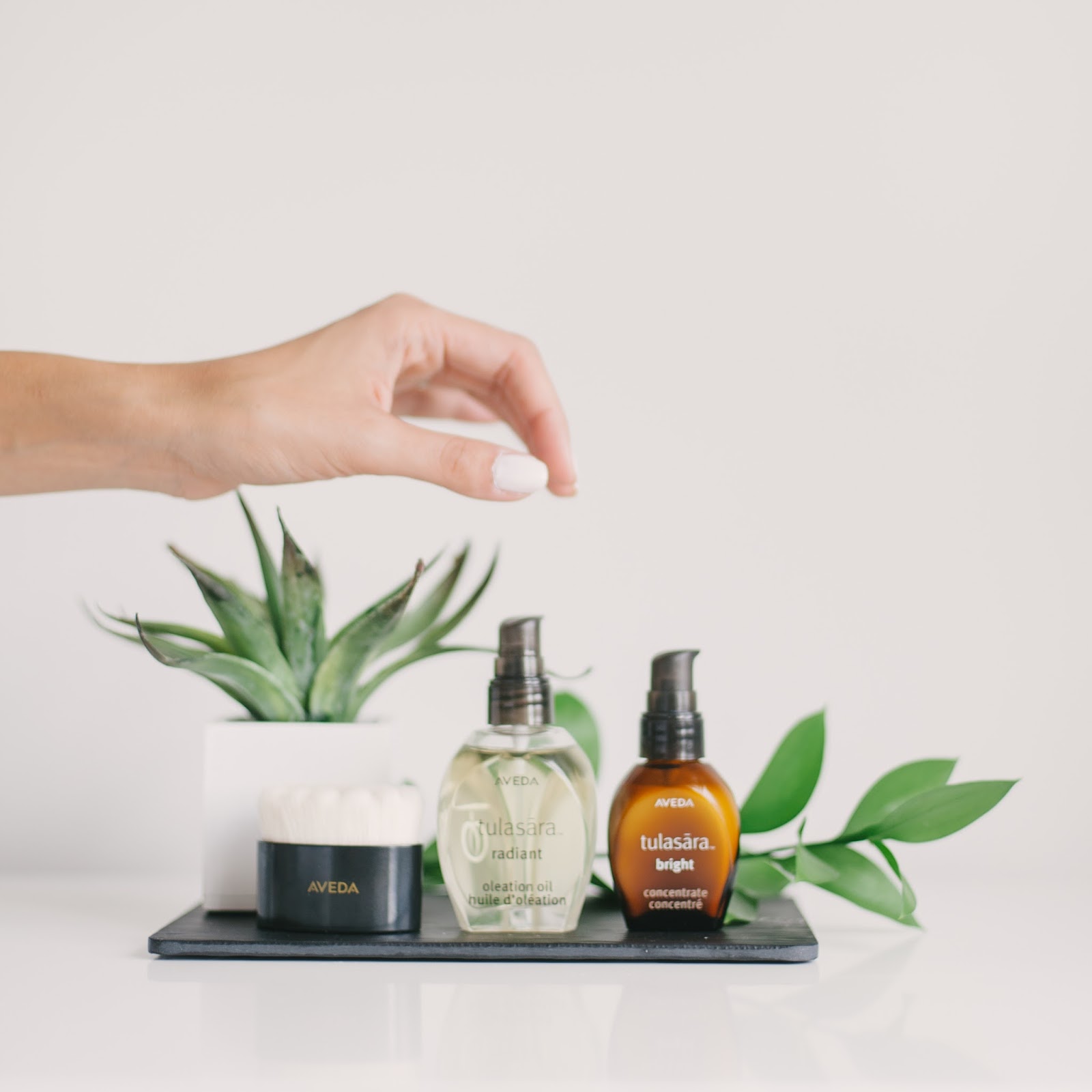 Taking a break from all things Party to get real for a second here. I’ve never had perfect or pretty skin.  As I’ve gotten older, I have definitely started taking much better care of it, and using excellent quality products is part of that. Aveda has recently launched a prestigious skin care line called Tulasara, which in Sanskrit means, ‘moving towards balance’ and I was so incredibly thrilled to try it out. The plant-powered Oleation Oil  is partnered with a patented, high quality dry brush, and the Bright Concentrate is remarkably light and feels amazing on my skin.