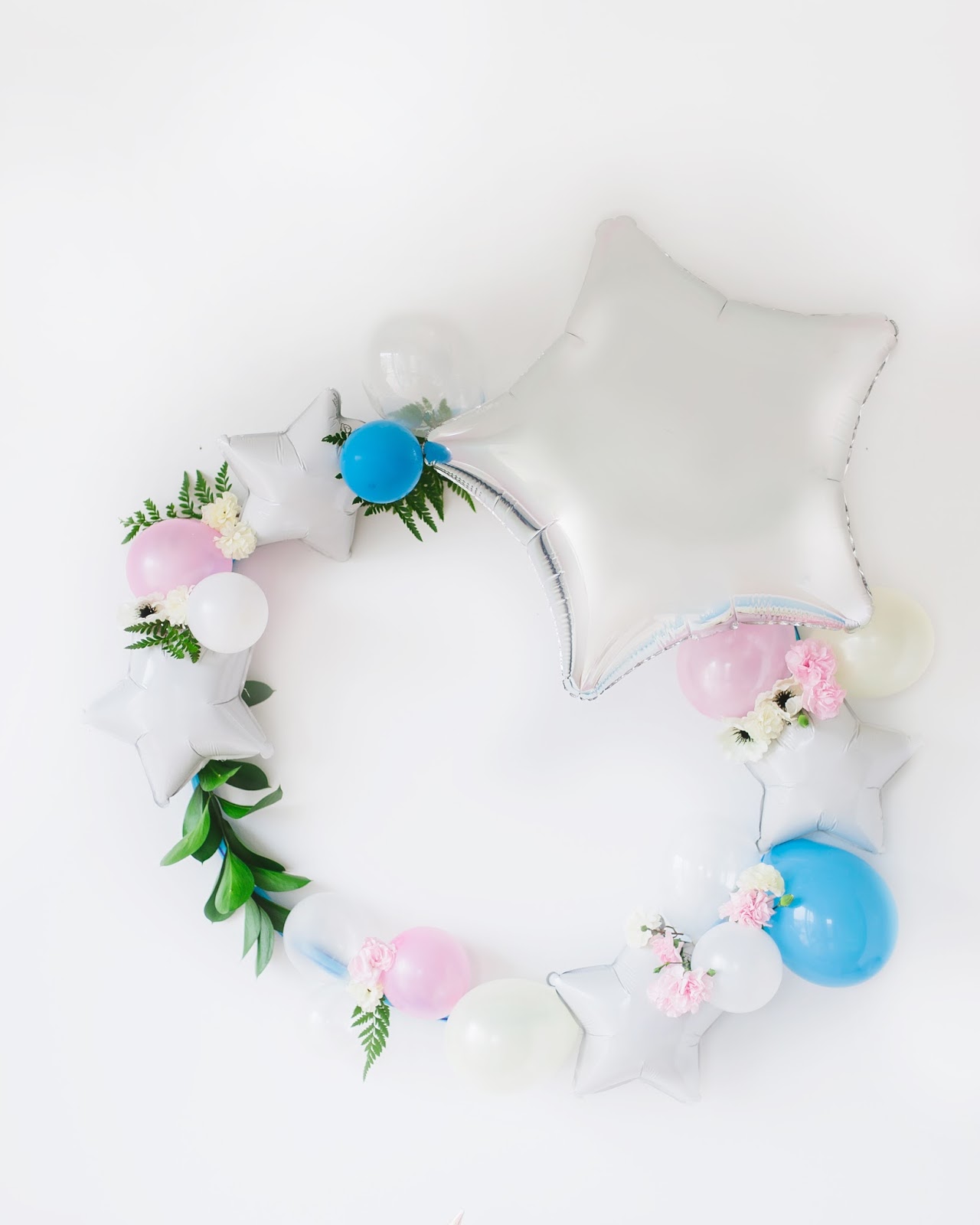 This backdrop installation is really simple too! I just used a hula hoop, some balloons from the dollarstore, flowers and greens. I attached the balloons with double sided tape and the greens with wire and hot glue…VOILA!