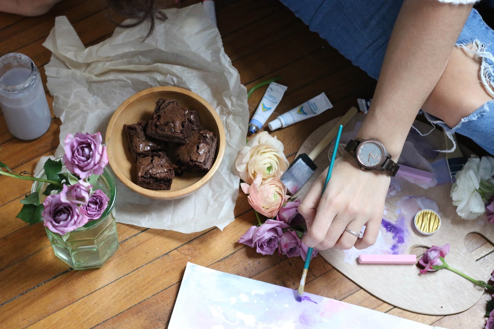 Our guest room/office is in preproduction for a makeover with JYSK. We are planning to transform the space with dark, moody wallpaper, a daybed, and tons of texture and personality. In the meantime I am very much enjoying the empty space. Maybe one day I will have a studio just to create in. Yes, I’d like that very much. I’ve decided to play with watercolours, treat myself to brownies and hazelnut coffee, and infuse some creative energy into the room. I found this great art store in our new neighbourhood called ARTiculations. I picked up some supplies I have never used before and have no idea how to, and began to play.